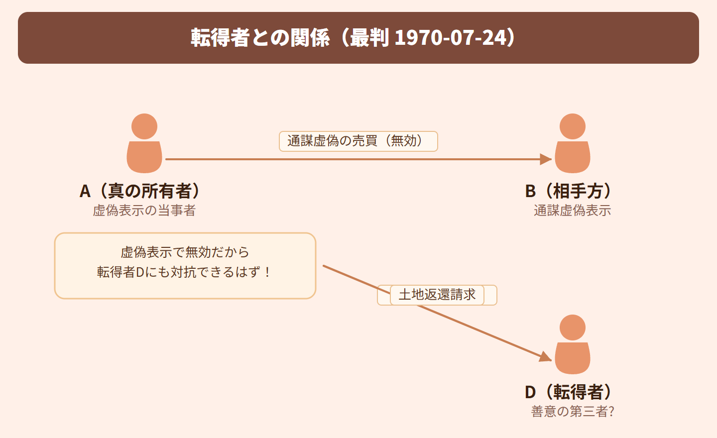 AとBが通謀して、実際には売買していないのに土地の所有権をBに移したように見せかけました。その後、BがCに土地を売却し、さらにCがDに転売しました。本当の所有者Aは、虚偽表示だからと主張して、転得者Dに対して土地の返還を求めました。この時、Dが94条2項の「第三者」として保護されるかが争点となりました。