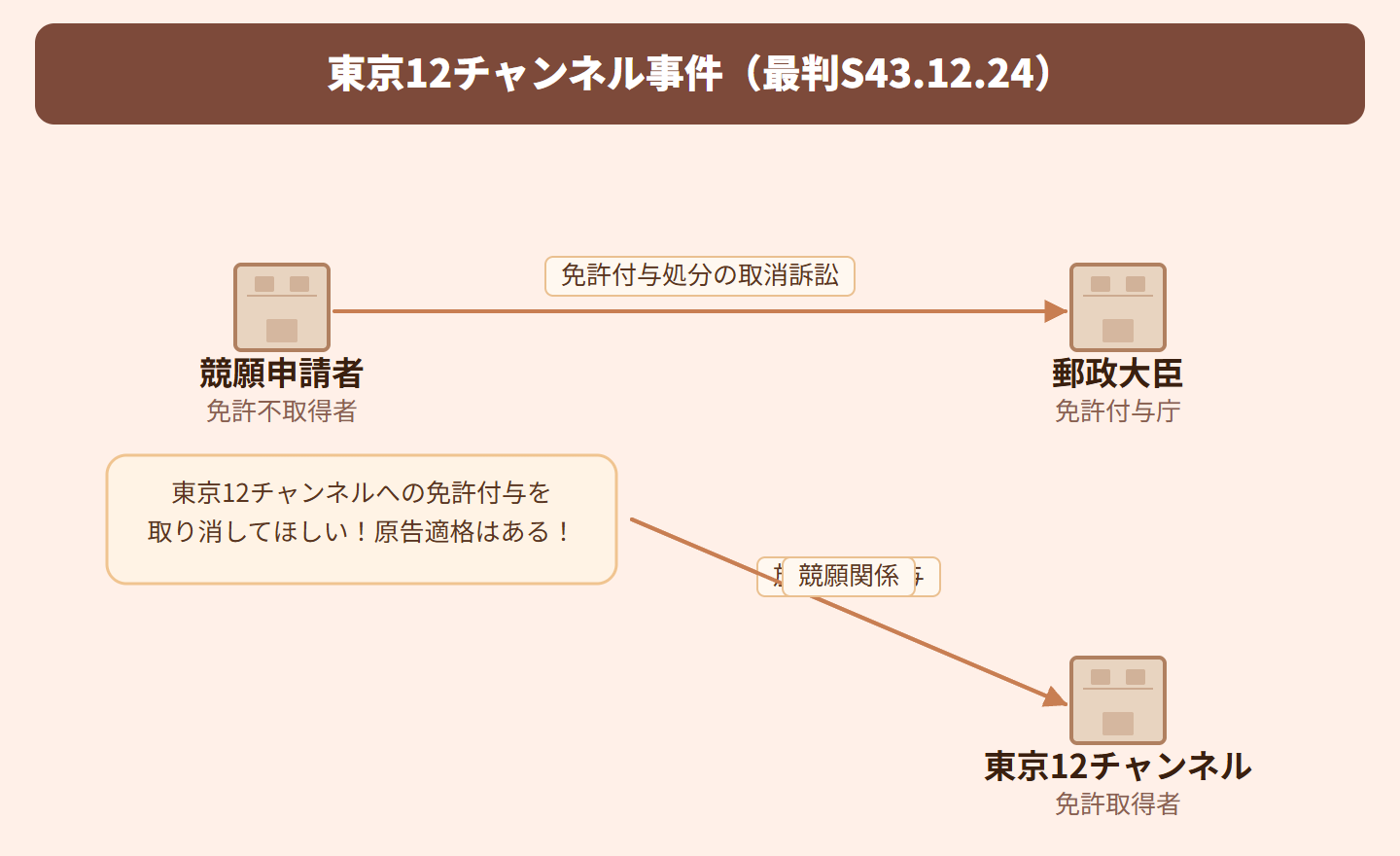 テレビ局の放送免許を複数の事業者が申請する競願関係で、東京12チャンネル(現テレビ東京)が免許を取得しました。免許を得られなかった他の申請者が、「東京12チャンネルへの免許付与処分を取り消してほしい」と訴訟を起こしましたが、そもそも訴訟を起こす資格(原告適格)があるのかが争われた事件です。