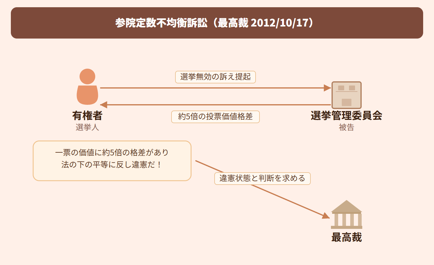 参議院議員選挙で、選挙区によって議員一人当たりの有権者数に最大約5倍の差があったため、有権者が「自分の一票の価値が他の選挙区より軽くて不平等だ」として、選挙の効力を争った事件です。参議院は「地域代表の性格がある」として衆議院より格差が許されるかが焦点となりました。