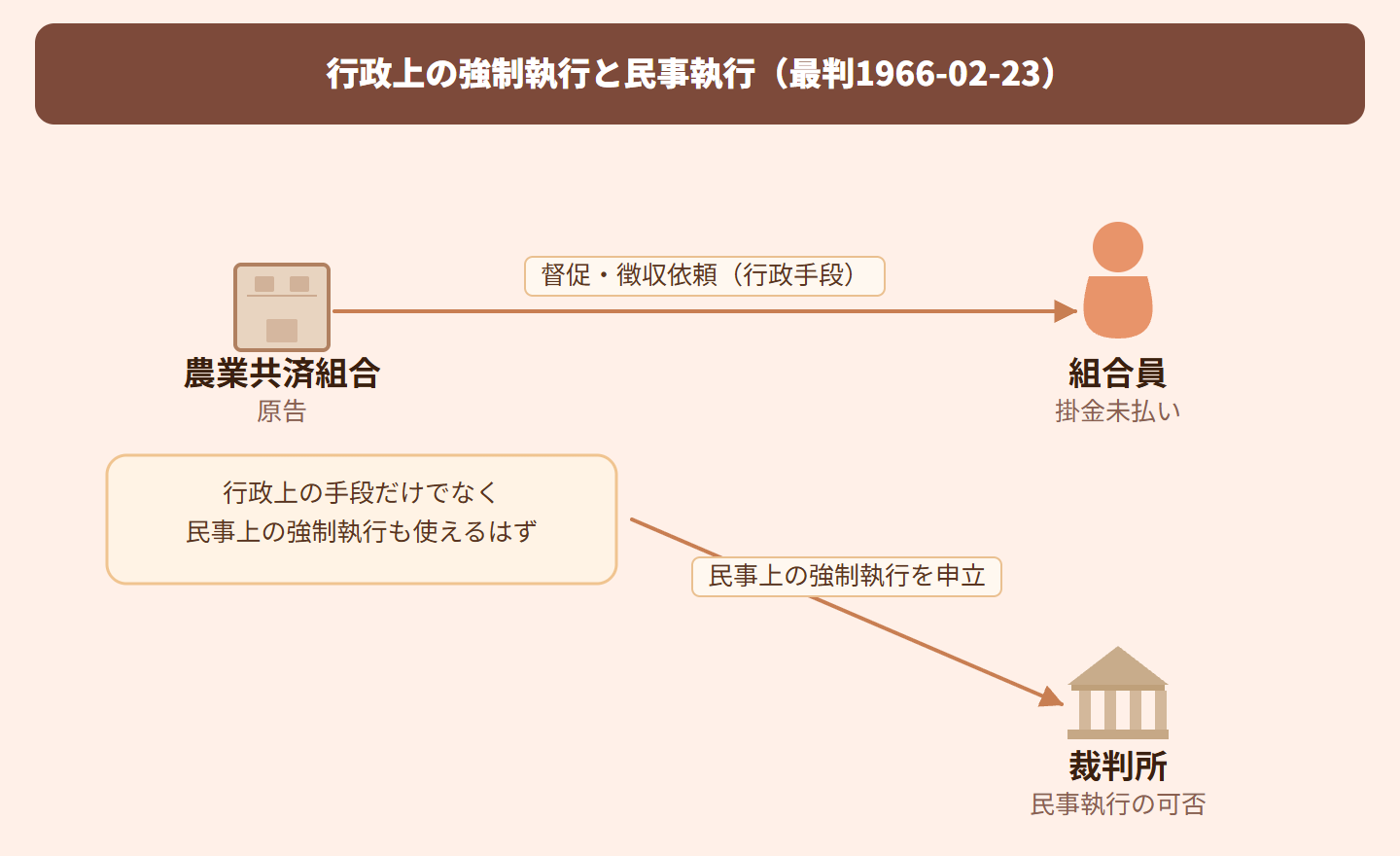 農業共済組合が、共済掛金を払わない組合員に対して、お金を回収しようとした事件です。法律では督促や市町村への徴収依頼という行政独自の取り立て手段が用意されていましたが、組合はそれとは別に、裁判所を通じた民事上の強制執行という方法も使えるのではないかと主張しました。裁判所がこの主張を認めるかどうかが争われました。