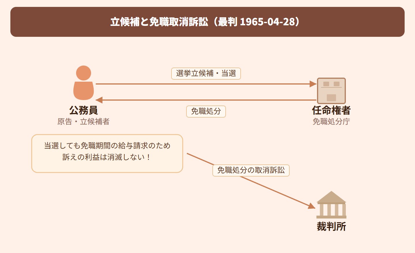 公務員が立候補・当選したとしても、免職処分が取り消されなければ、失われた給与請求権(本来受け取れたはずの給料を請求する権利)などの経済的な権利は回復されない。そのため、処分の取消しを求める法律上の利益(訴えを続ける必要性)は消滅せず、引き続き裁判で争うことができる。