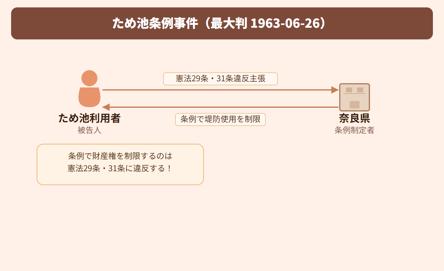 奈良県がため池の安全を守るため、条例で堤防部分の使用を制限しました。これに対して、条例による財産権の制限が憲法29条に違反するのではないか、また手続き保障の面で憲法31条に違反するのではないかが争われました。最高裁は、災害防止という公共の福祉のための合理的な制限であり、通常受忍すべき範囲内だとして合憲と判断しました。