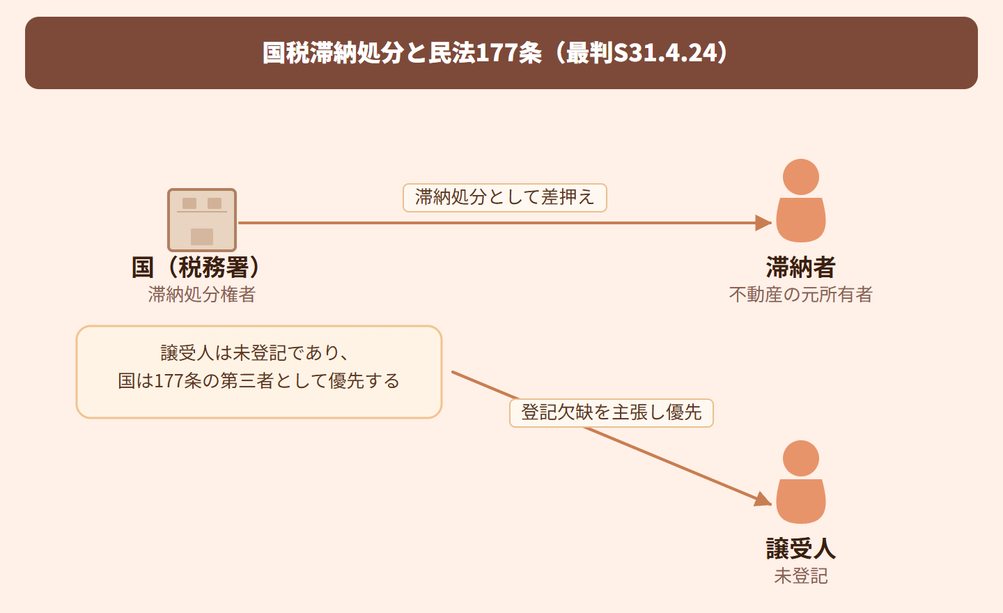国税滞納処分において国は、自ら執行機関として差押えを行うため、その立場は民事執行における差押債権者と同様である。租税債権が公法上のものであることを理由に国が私法上の債権者より不利に扱われる根拠はないため、民法177条が適用される。また、国が登記の欠缺(登記がないこと)を主張することが背信的とはいえないとされた。