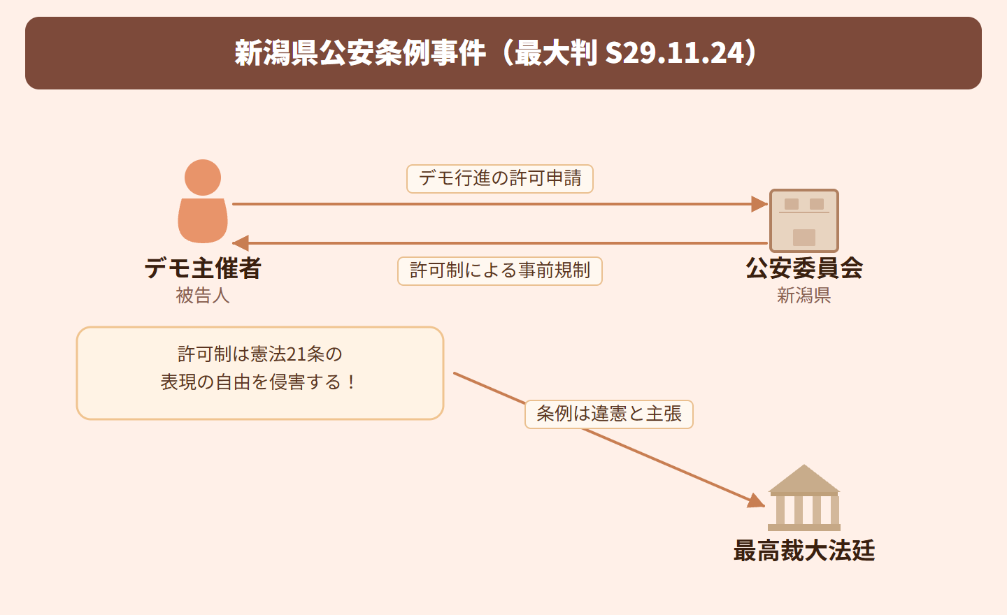 新潟県の条例が、デモ行進などの集団示威運動を行う際に、事前に公安委員会の許可を受けることを義務付けていました。この許可制が表現の自由を保障する憲法21条に違反するのではないかと争われた事件です。最高裁は、公共の秩序維持のための合理的な規制として合憲と判断しました。