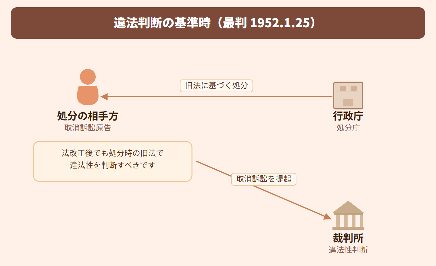 要するに、行政処分が違法かどうかは「処分した時点」の法律で判断するってこと!後で法律が変わっても、処分時に合法なら問題なし、違法なら取り消されるということです。