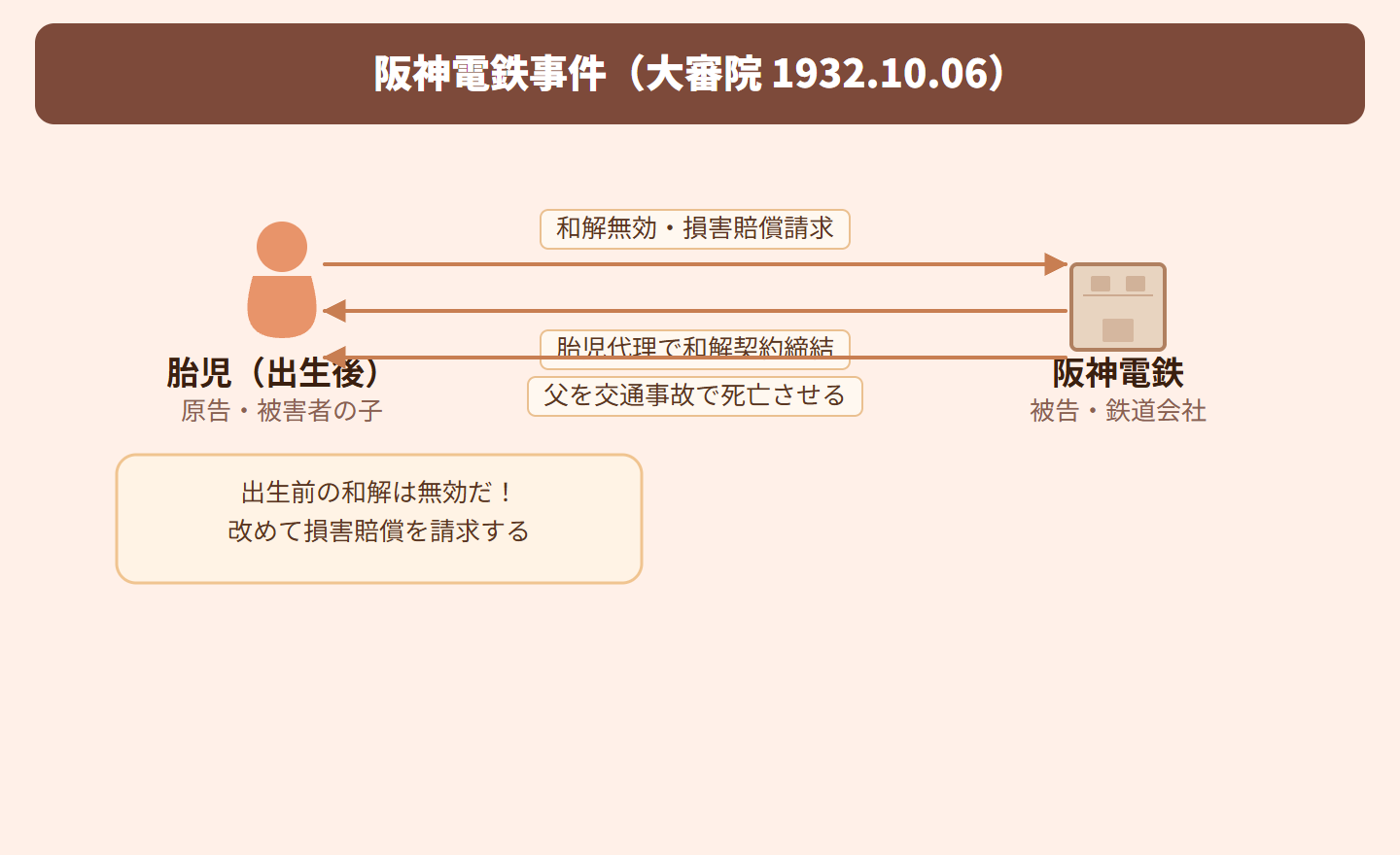 要するに、お腹の中にいる胎児には法律上の人格がまだないから、代理人を立てて和解するなんてできない。生まれる前の和解は無効ってこと!