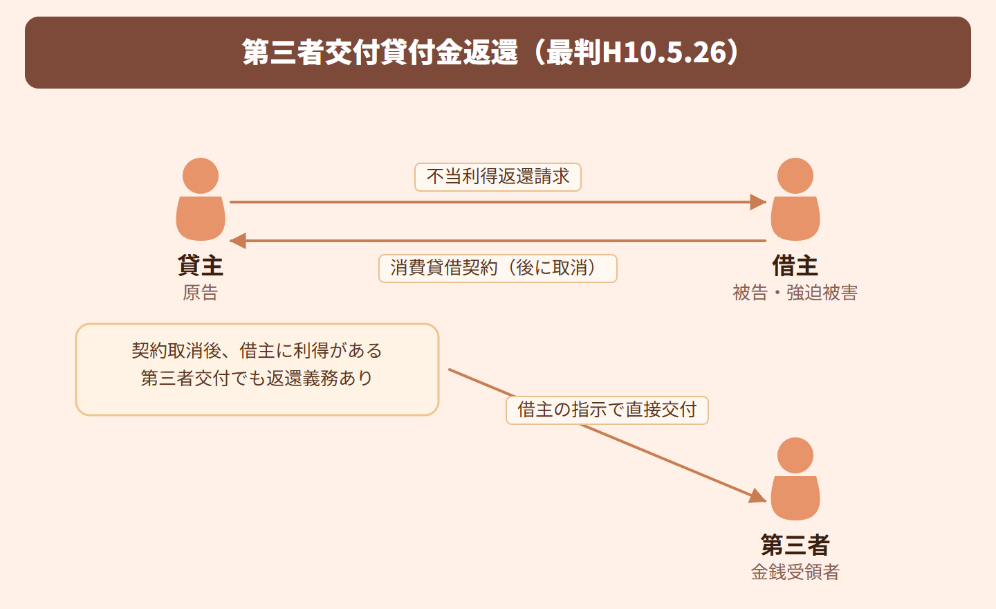 原則として、借主が貸主に対して第三者へお金を渡すよう指示し、その通りに給付が行われた後に契約が取り消された場合、借主は特別な事情がない限り、その給付額に相当する利益を受けたものとみなされる。ただし、借主と第三者の間に事前の法律上・事実上の関係が一切なく、借主が強迫(脅し)によって指示させられたような特別な事情がある場合は、借主は利益を受けていないと判断される。