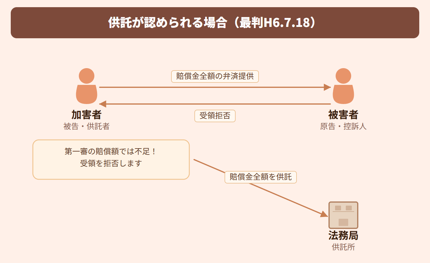 要するに、控訴審で争っている最中でも、加害者が第一審判決の金額を提供して拒絶されたら、その後の供託は有効ってこと!判決確定前でも供託できるんです。