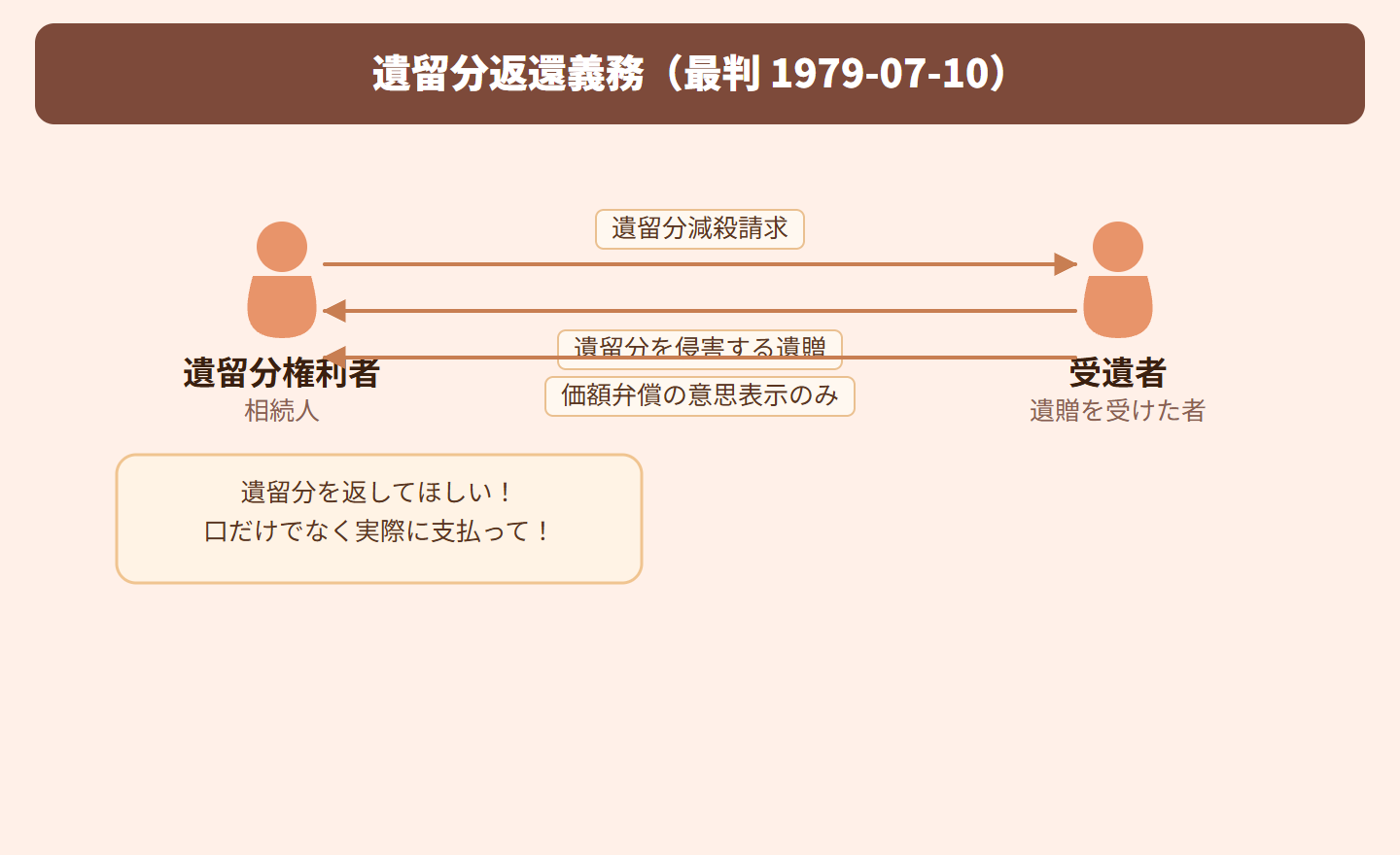 【試験での重要ポイント】 ①価額弁償の意思表示だけでは返還義務は免れない ②実際の弁済または弁済の提供が必要 ③単なる意思表示のみを認めると、遺留分権利者が確実に金銭を受け取れる保障がなくなる ④「意思表示のみでは不十分」という結論を確実に押さえること ⑤遺留分制度の趣旨(相続人の生活保障)から、実効性のある支払いが求められる
