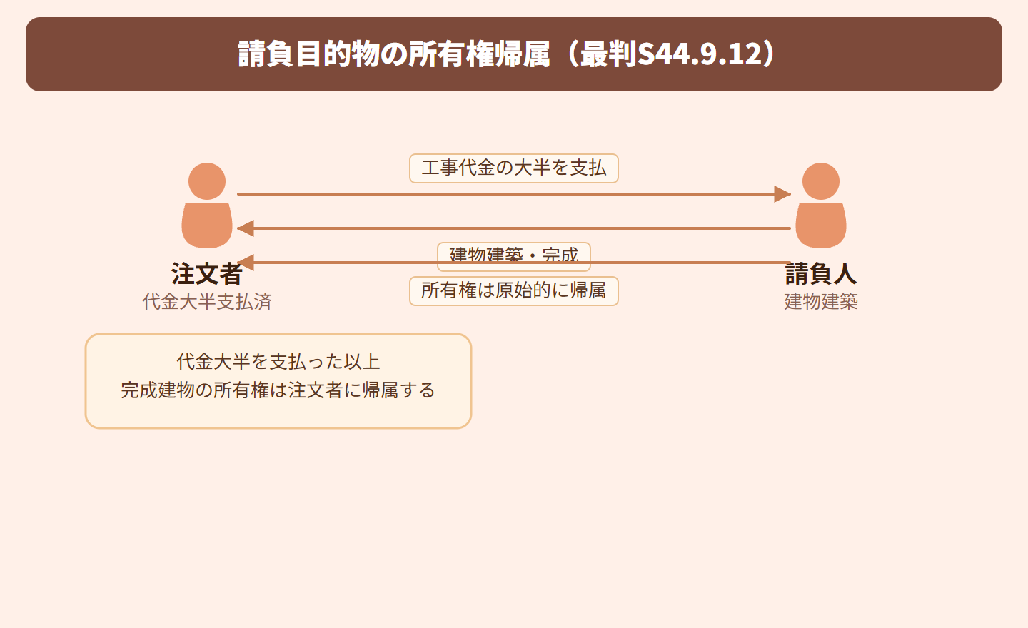 注文者が建物の建築を請負人に依頼し、工事代金の半額以上を棟上げ時までに支払い、その後も工事の進行に応じて残代金を支払ってきました。この場合、完成した建物の所有権は引き渡しを受ける前から注文者に帰属するのか、それとも請負人に一旦帰属するのかが争われた事件です。