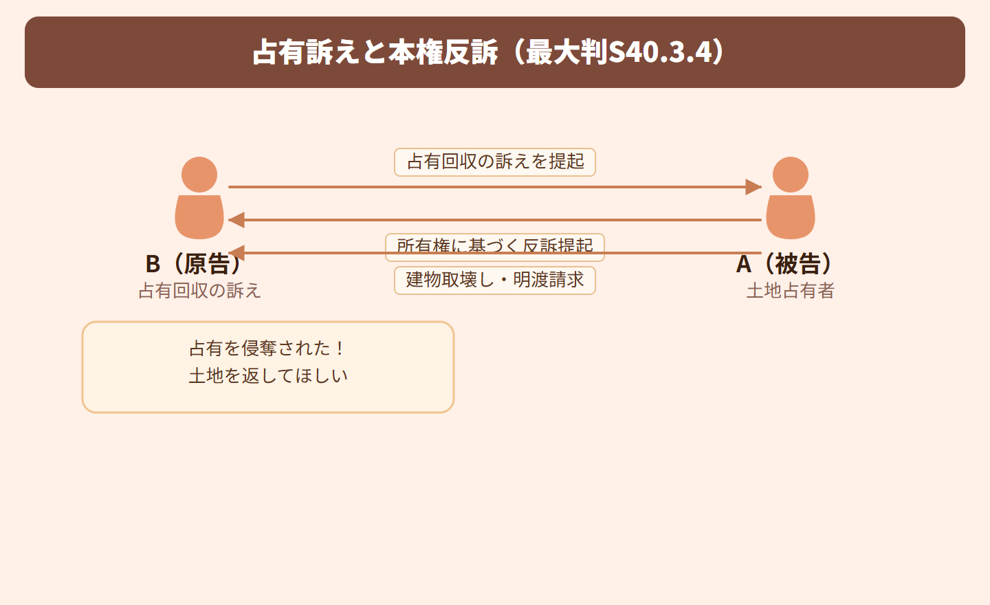 要するに、占有の訴えで「自分に所有権がある」と防御するのはダメだけど、反訴として別に本権に基づく請求をするのはOKってこと!