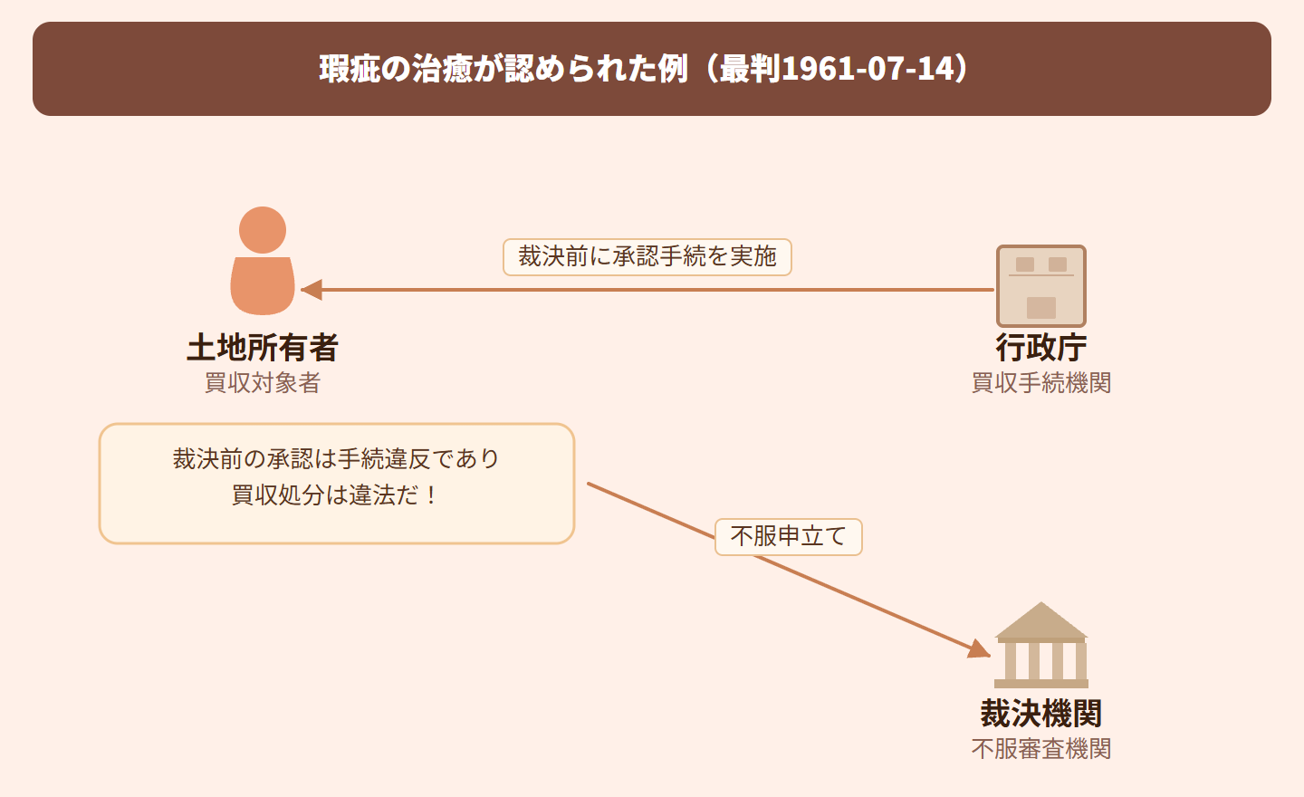 【重要ポイント】 ①瑕疵の治癒:行政行為の手続上の欠陥が、後の処分によって補われること ②本件では承認を「訴願棄却の裁決を停止条件としてなされたもの」と解釈 ③実際に棄却裁決がなされたことで、手続を先行させた瑕疵が治癒された ④試験では「瑕疵の治癒が認められる場合」として出題される可能性あり ⑤停止条件的な解釈により、形式的な手続違反を実質的に是正した点がポイント