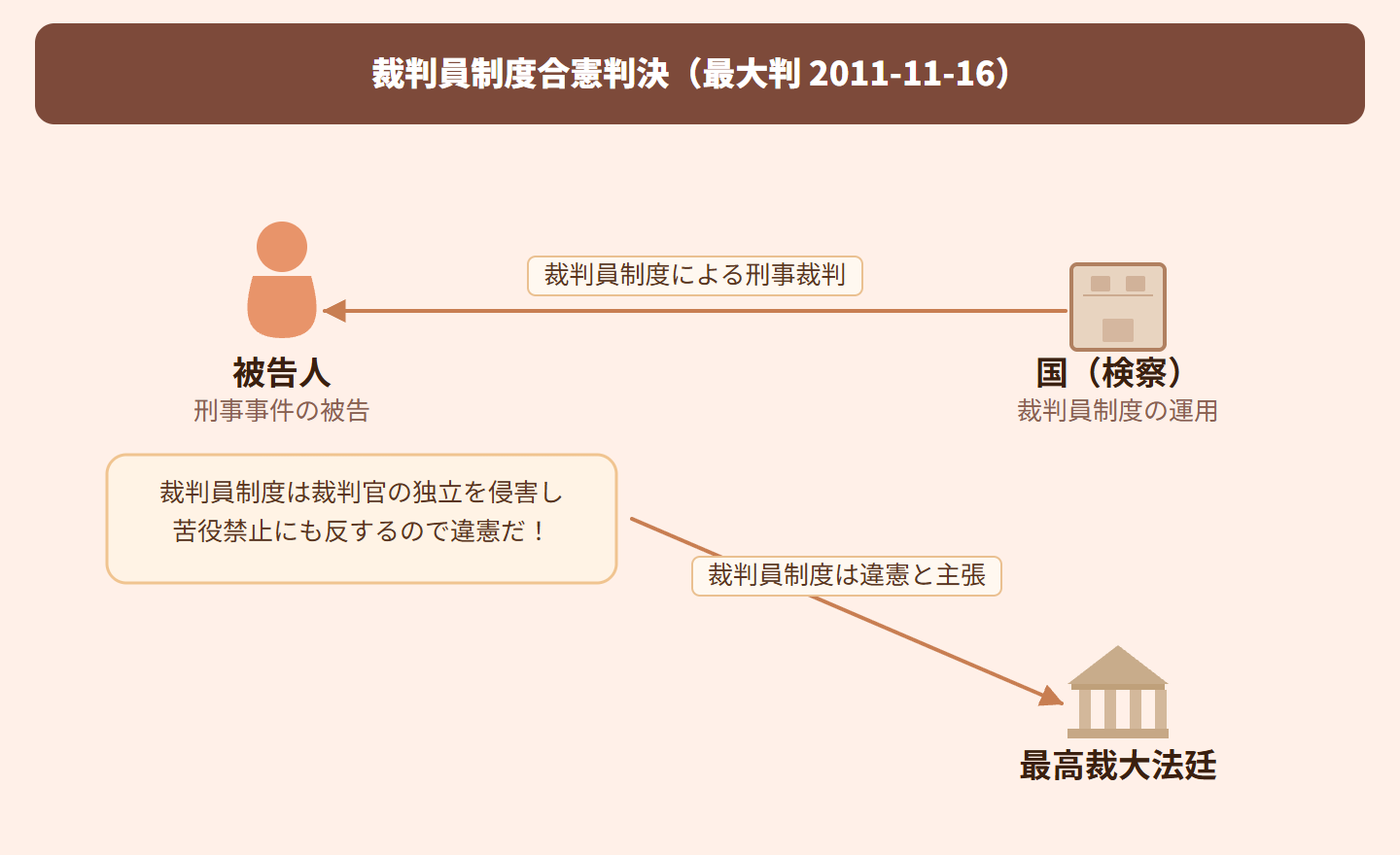 憲法18条(苦役の禁止)、31条(適正手続の保障)、32条(裁判を受ける権利)、37条1項(公平な裁判所の裁判を受ける権利)、76条3項(裁判官の独立)に関わる判例です。国民の司法参加と憲法上の諸原則との整合性が争点となりました。