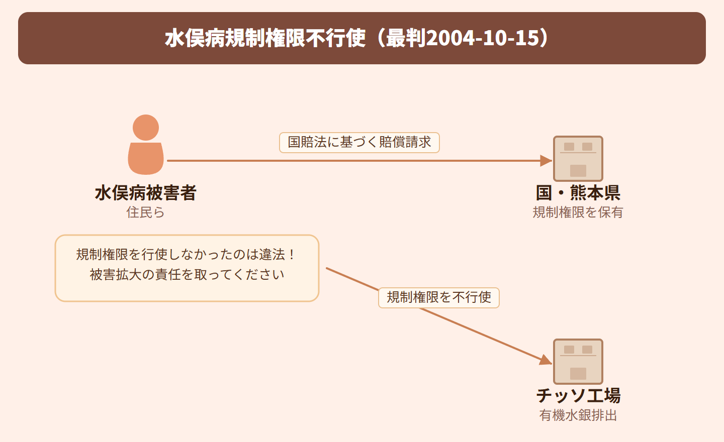 熊本県水俣市で、工場排水に含まれる有機水銀によって深刻な健康被害(水俣病)が発生しました。国と県は法律に基づいて工場の操業を規制する権限を持っていましたが、長年にわたってその権限を行使せず、被害が拡大しました。被害者たちは、国と県が規制権限を使わなかったことが違法だとして、損害賠償を求めて訴えを起こしました。