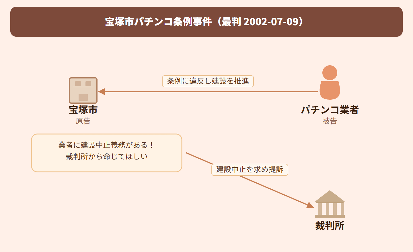 宝塚市がパチンコ店建設を規制する条例を制定しました。ある業者が条例に違反して建設を進めようとしたため、市は業者に建設中止を命じる義務があると主張し、裁判所に訴えを起こしました。しかし裁判所は、行政が住民に義務を命じるために訴訟を起こすことは原則として認められないとして、訴えを不適法としました。