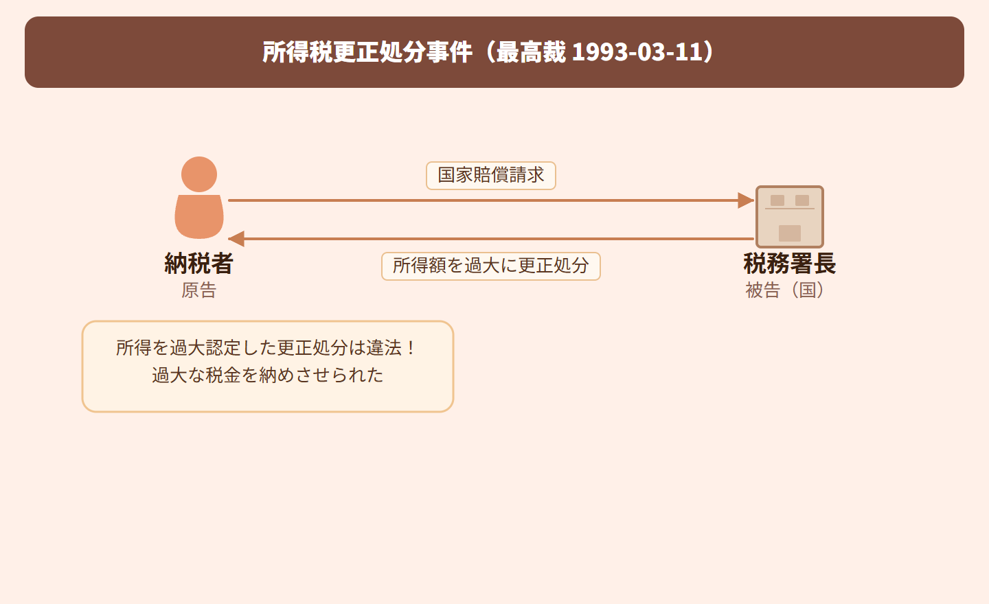 税務署長が納税者の所得金額を実際より多く見積もって更正処分(税額を増やす処分)を行いました。納税者は過大な税金を納めることになったため、この処分は違法だとして国家賠償を請求しました。裁判所は、結果的に所得金額を過大に認定していても、それだけでは国家賠償法上の違法とはならないと判断しました。