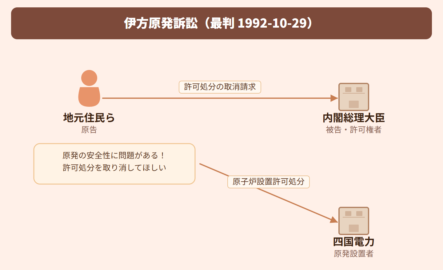 愛媛県の伊方町に原子力発電所を設置する許可が内閣総理大臣によって出されたことに対し、地元住民らがその安全性を争って許可処分の取消しを求めた事件です。原子炉の安全性という高度に専門的な判断について、裁判所がどこまで審査できるのかが問題となりました。