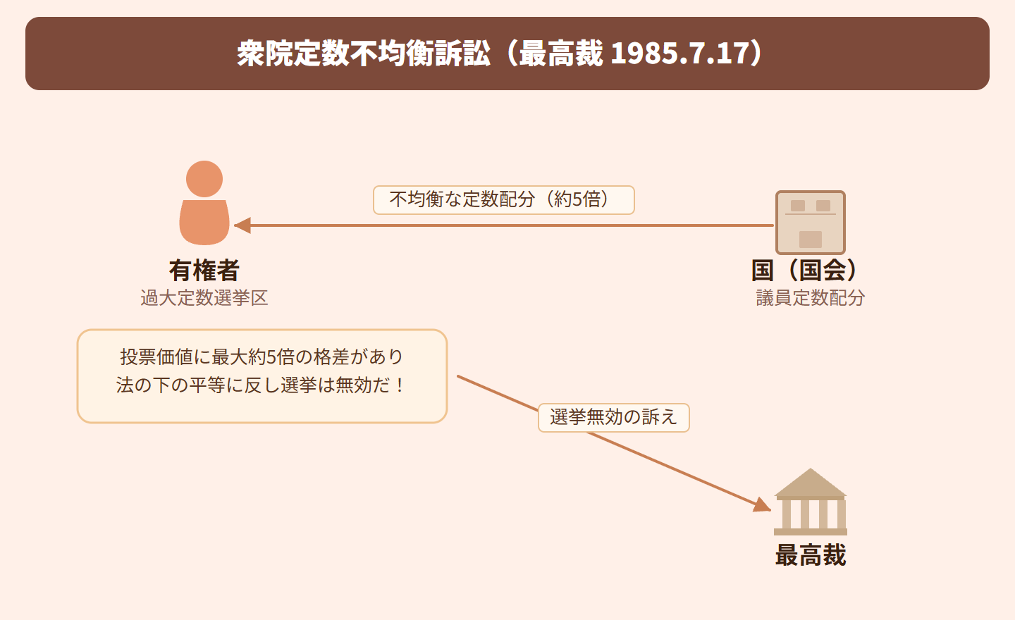 憲法14条1項の平等原則は、選挙権についても各選挙人の投票価値の平等を要求する。定数配分規定の合憲性は、�@違憲状態かどうか、�A是正するための合理的な期間内に国会が改正しなかったかどうか、の2点で判断される。本件では8年以上改正されず違憲と判断されたが、選挙を無効にするとかえって混乱を招くため、事情判決の法理(本来は無効とすべき場合でも公益上の理由から無効としない考え方)により選挙自体は有効とした。