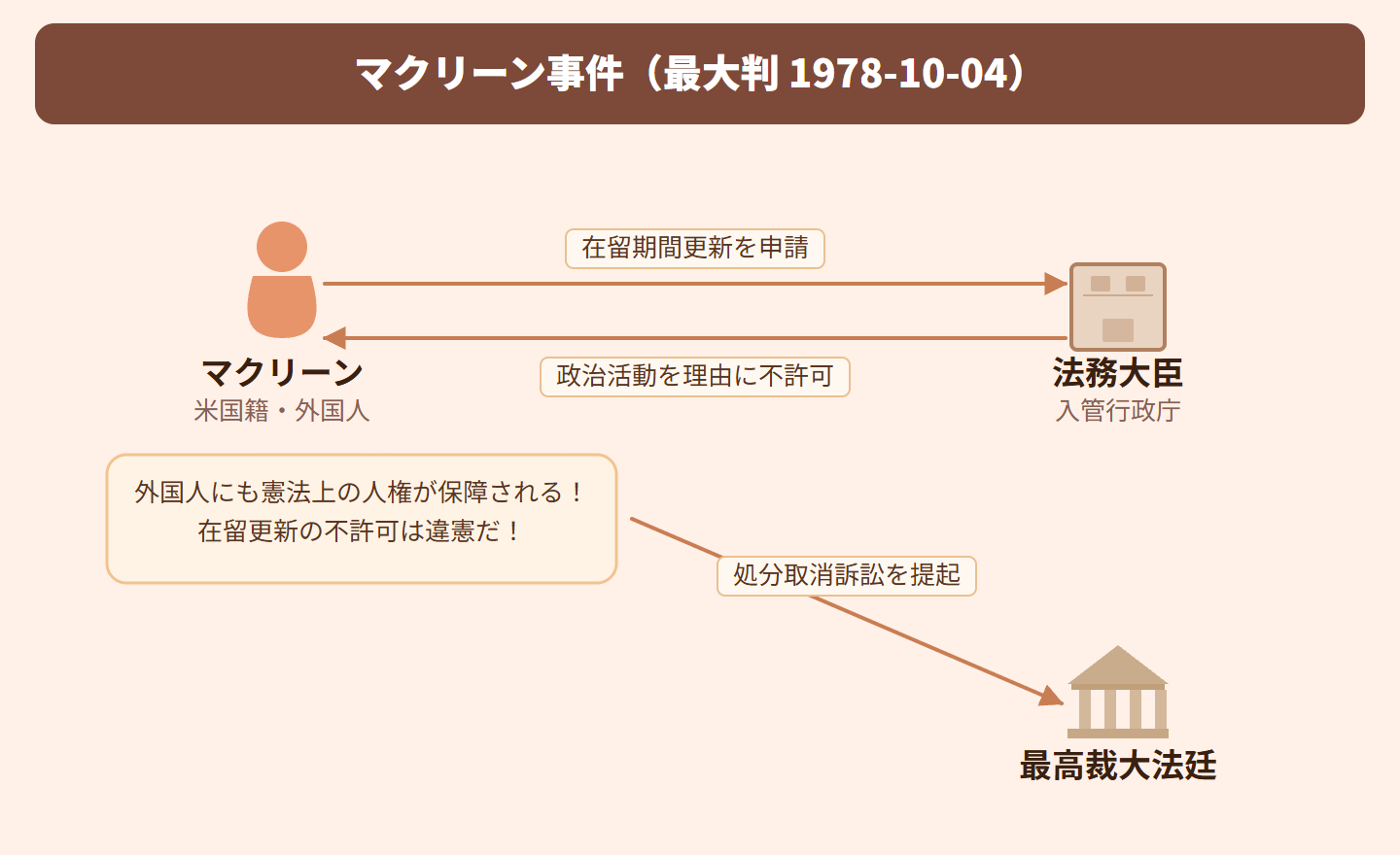 アメリカ人のマクリーンさんが日本に在留中、政治活動に参加したことを理由に、在留期間の更新が不許可とされました。マクリーンさんは、外国人にも憲法上の人権が保障されるはずだとして、この処分の取消しを求めて裁判を起こしました。