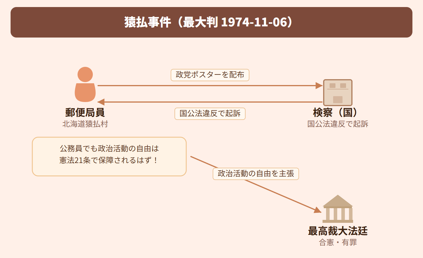北海道の郵便局員が、特定の政党を支持する目的でポスターを配布したところ、国家公務員法違反で起訴されました。この職員は「政治活動の自由は憲法21条で保障されているのに、公務員だからといって制限するのはおかしい」と主張して争いました。最高裁は公務員の政治的中立性を重視し、制限を合憲と判断しました。