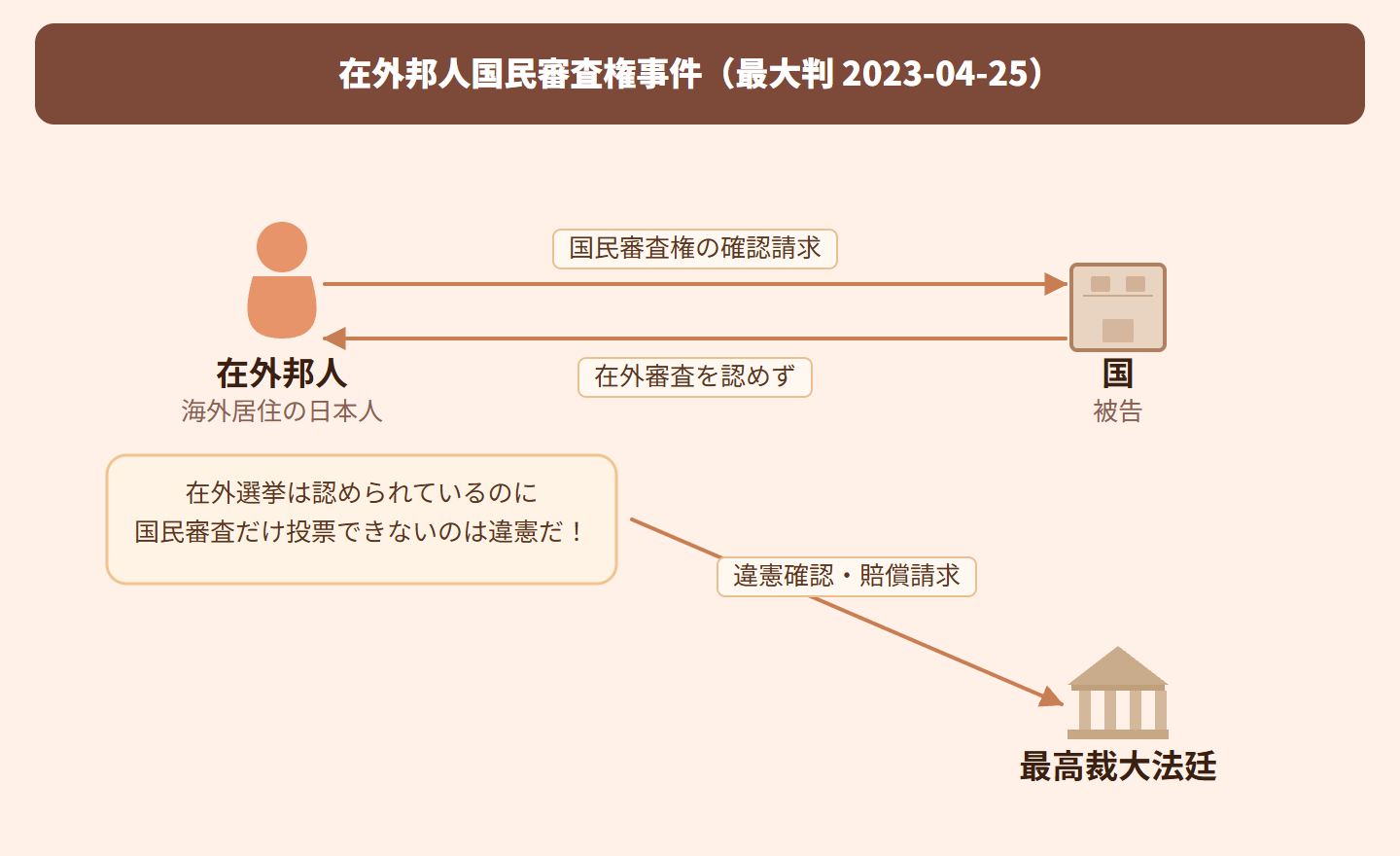 海外に住んでいる日本人が、最高裁判所の裁判官をやめさせるかどうかを決める国民審査に投票できないのはおかしいと訴えました。すでに国政選挙では在外投票制度があるのに、国民審査だけ投票できないのは憲法違反だと主張。裁判所は、在外選挙制度があるのに国民審査を認めない理由はないとして、違憲と判断しました。