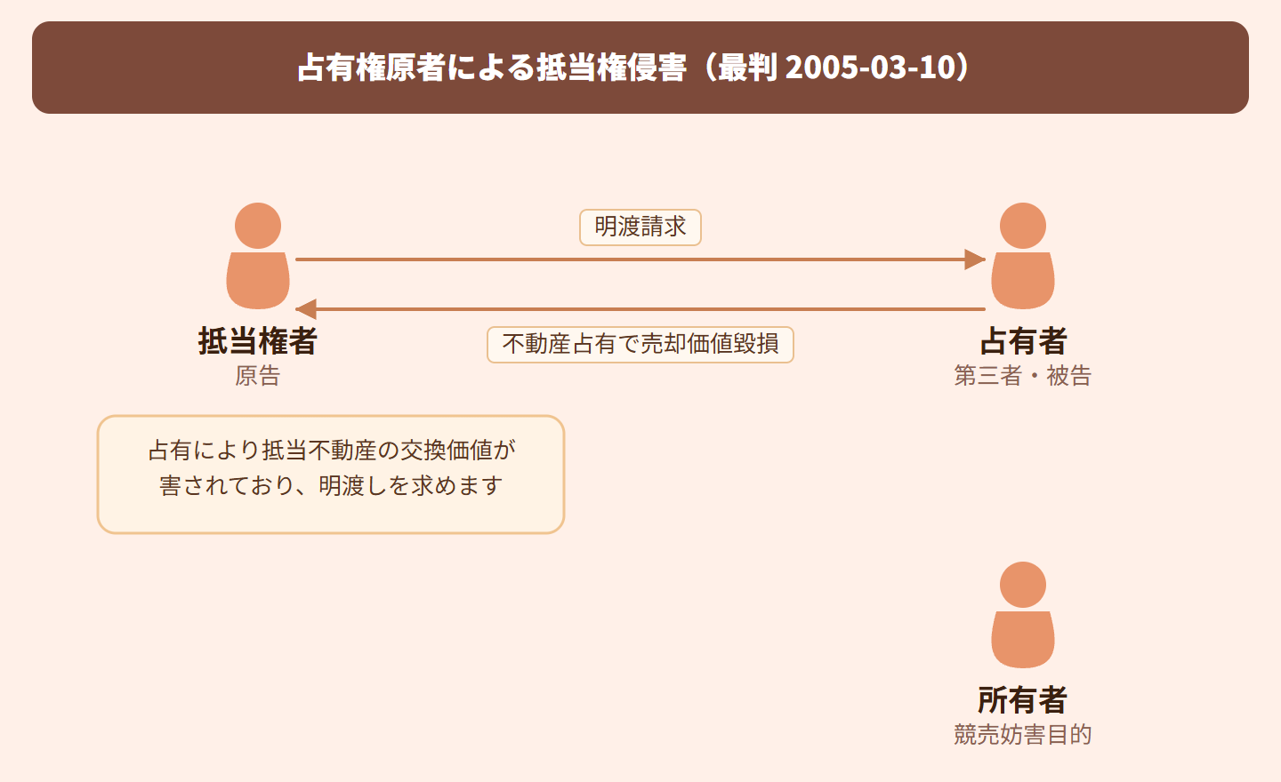 競売手続き(強制的に不動産を売却する手続き)を妨害する目的で占有権原が設定され、その占有によって不動産の交換価値(売却で得られる価値)の実現が困難になっている場合、抵当権者は妨害排除請求として占有者に直接自己への明渡しを求めることができる。ただし、抵当権者は不動産を自ら使用・収益できないため、賃料相当損害金(家賃に相当する損害の賠償金)の請求はできない。
