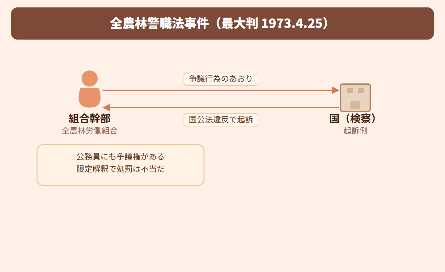 要するに、公務員は国民全体の奉仕者だから、ストライキなどの権利は一般の労働者より制限されても憲法違反じゃない。でも、処罰範囲を勝手に狭く解釈するのはダメってこと!