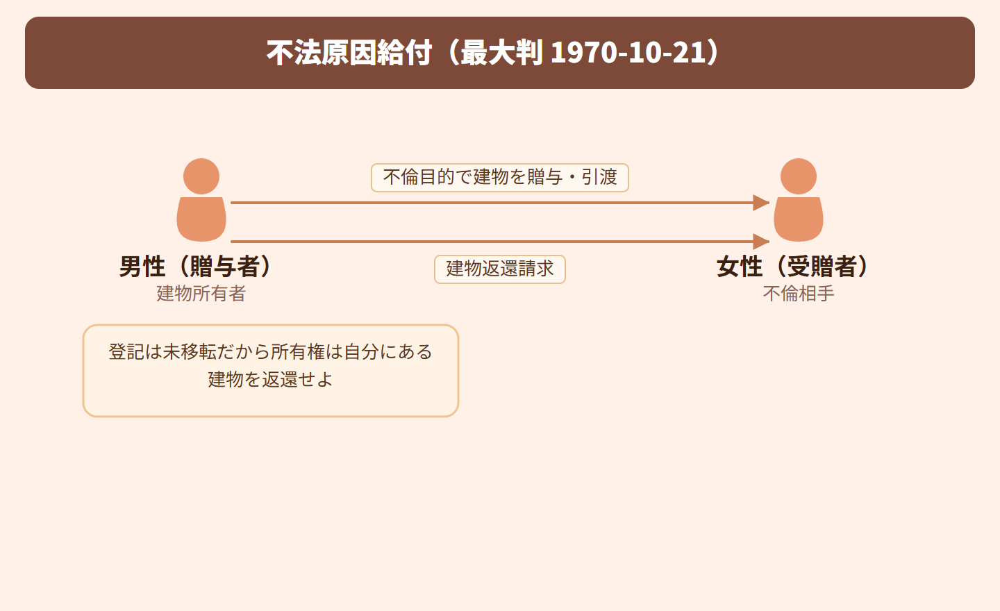 ある男性が不倫相手の女性との関係を続けるために、自己所有の建物を贈与して引き渡しました。その後、男性は女性に対して建物の返還を求めて訴えを起こしました。男性は「登記はまだ移転していないから自分に所有権がある」と主張しましたが、そもそも不倫関係の維持という不法な目的で渡した建物について、返還を求めることができるかが争われました。