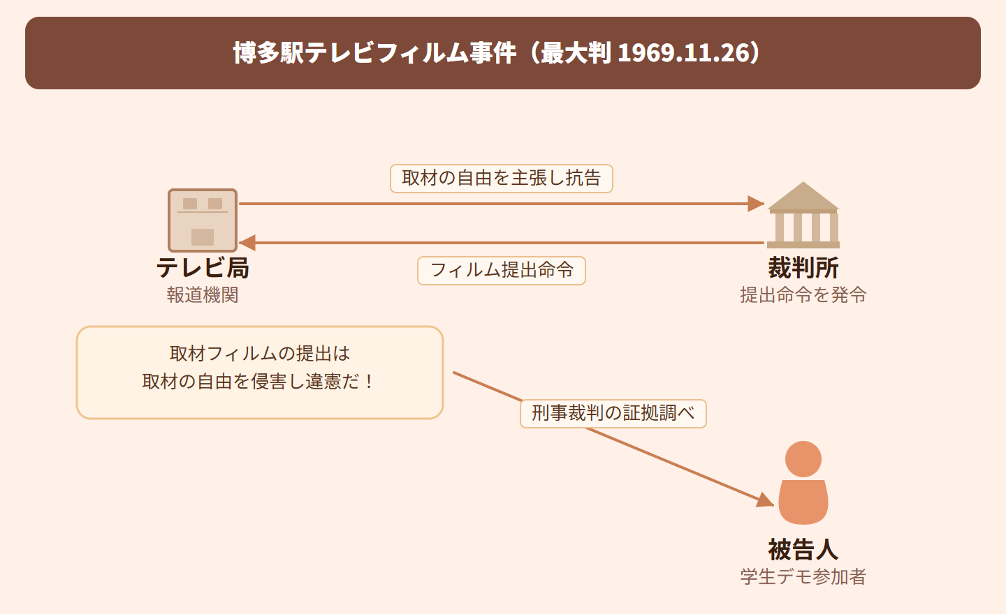 要するに、報道の自由は大事だけど、重要な刑事裁判のためには取材フィルムの提出を求められることもあるってこと!すでに放送済みなら特に問題ないとされました。