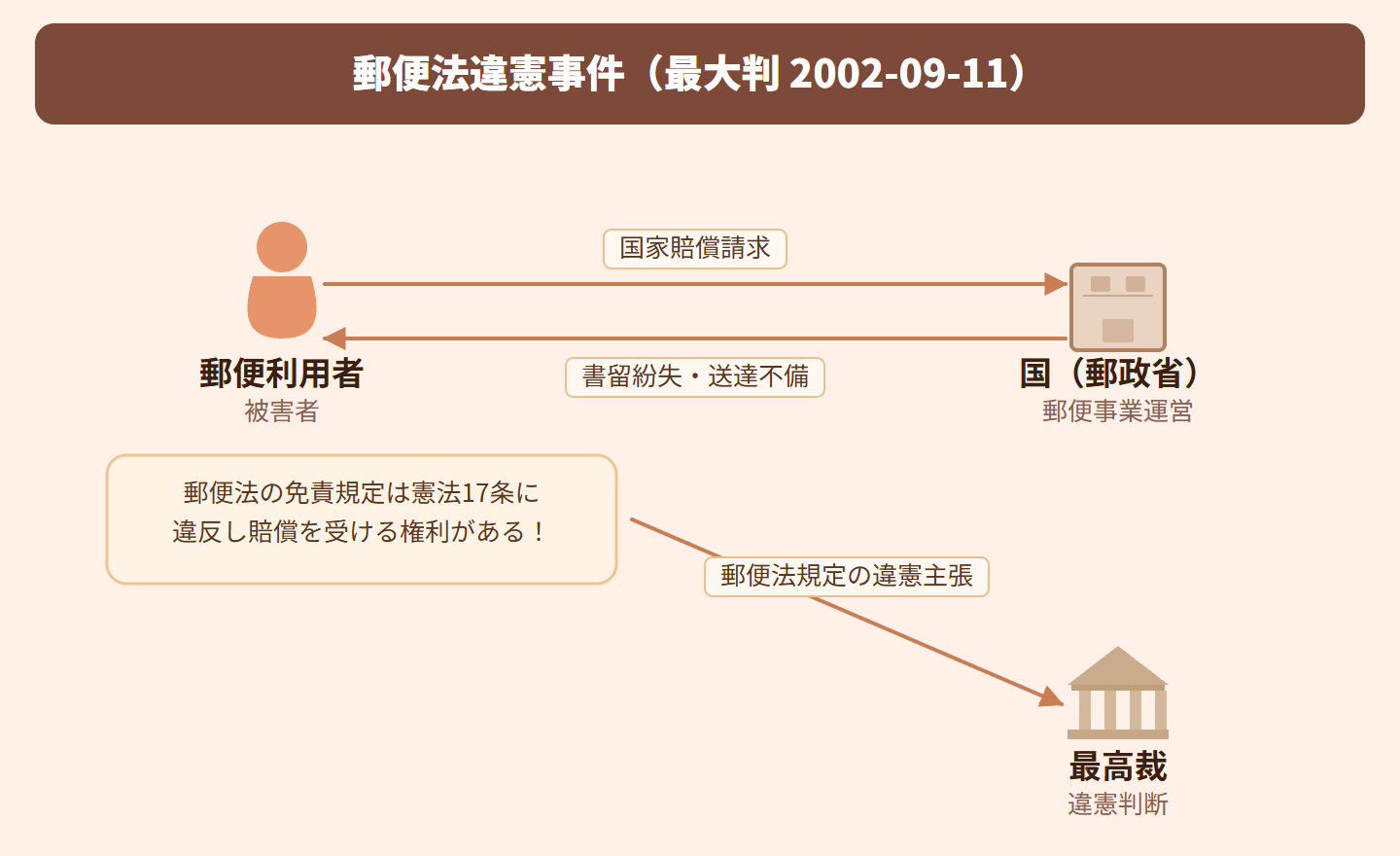 要するに、郵便局員のミスで損害が出ても国は賠償しなくていいという郵便法の規定は、憲法が保障する国家賠償請求権を侵害していて違憲だってこと!