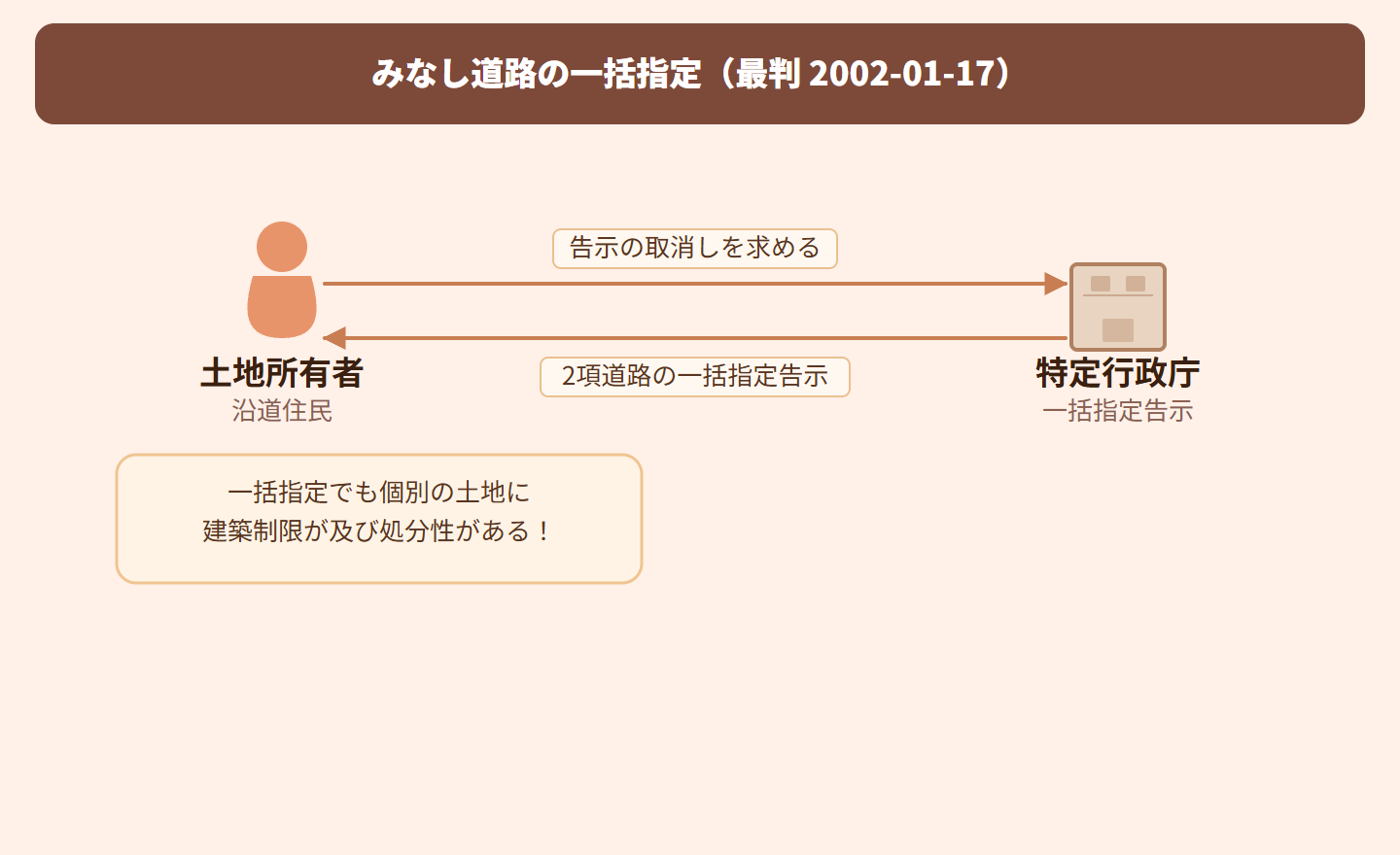 【処分性の判断基準】 ①一括指定という形式でも、条件に合致する個々の道路すべてに指定効果が直接生じる ②その結果、敷地所有者は道路内の建築制限(44条)や私道の変更・廃止制限(45条)という具体的な私権制限を受ける ③個人の権利義務に直接影響を与えるため、抗告訴訟の対象となる行政処分にあたる ※一括指定か個別指定かという形式ではなく、実質的に権利義務への直接的影響があるかで判断