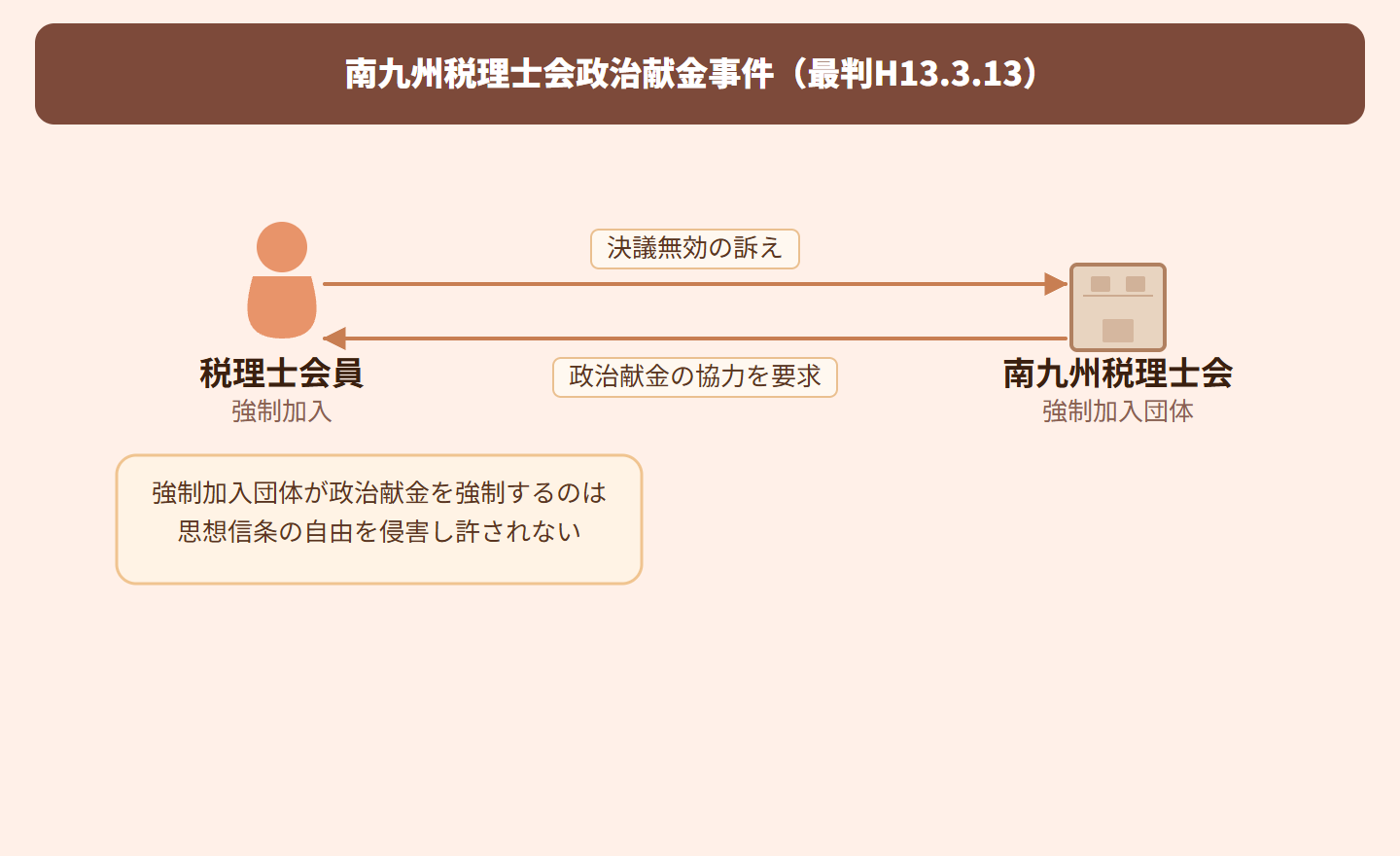 【試験での頻出ポイント】 ①強制加入団体とは:会員が脱退の自由を持たない団体(税理士会、弁護士会など) ②政治献金の性質:政治的思想・信条に深く関わる事柄であり、個人の自由が最大限尊重されるべき ③結論:強制加入団体が政治献金を行うことは「目的の範囲外」として違法 ④理由:多数決で決定できる事項には限界があり、会員個人の政治的自由を侵害してはならない ⑤比較:任意加入団体なら脱退の自由があるため、同じ制約は及ばない