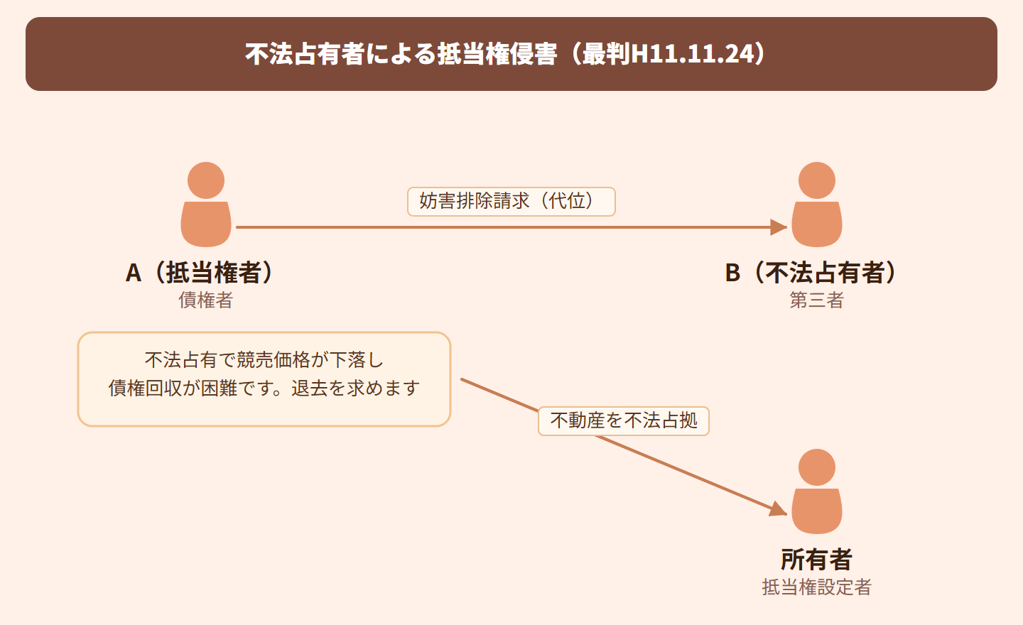 「競売で売れないのは不法占拠者がいるせい!でも抵当権者は直接追い出せないし、所有者も何もしてくれない…」って状況。抵当権は「使用収益」ではなく「換価価値」を把握する権利だから、原則として占有に干渉できないんだよね。でも競売が完全に妨害されてるような場合は話が別!「所有者は抵当権者に対して不動産を適切に管理する義務を負っている」→「その義務を保全するために民法423条の法意に従って代位行使できる」という論理構成で、不法占拠者に直接自己への明渡しを求めることができるとした、債権者代位権の転用類型の重要判例!