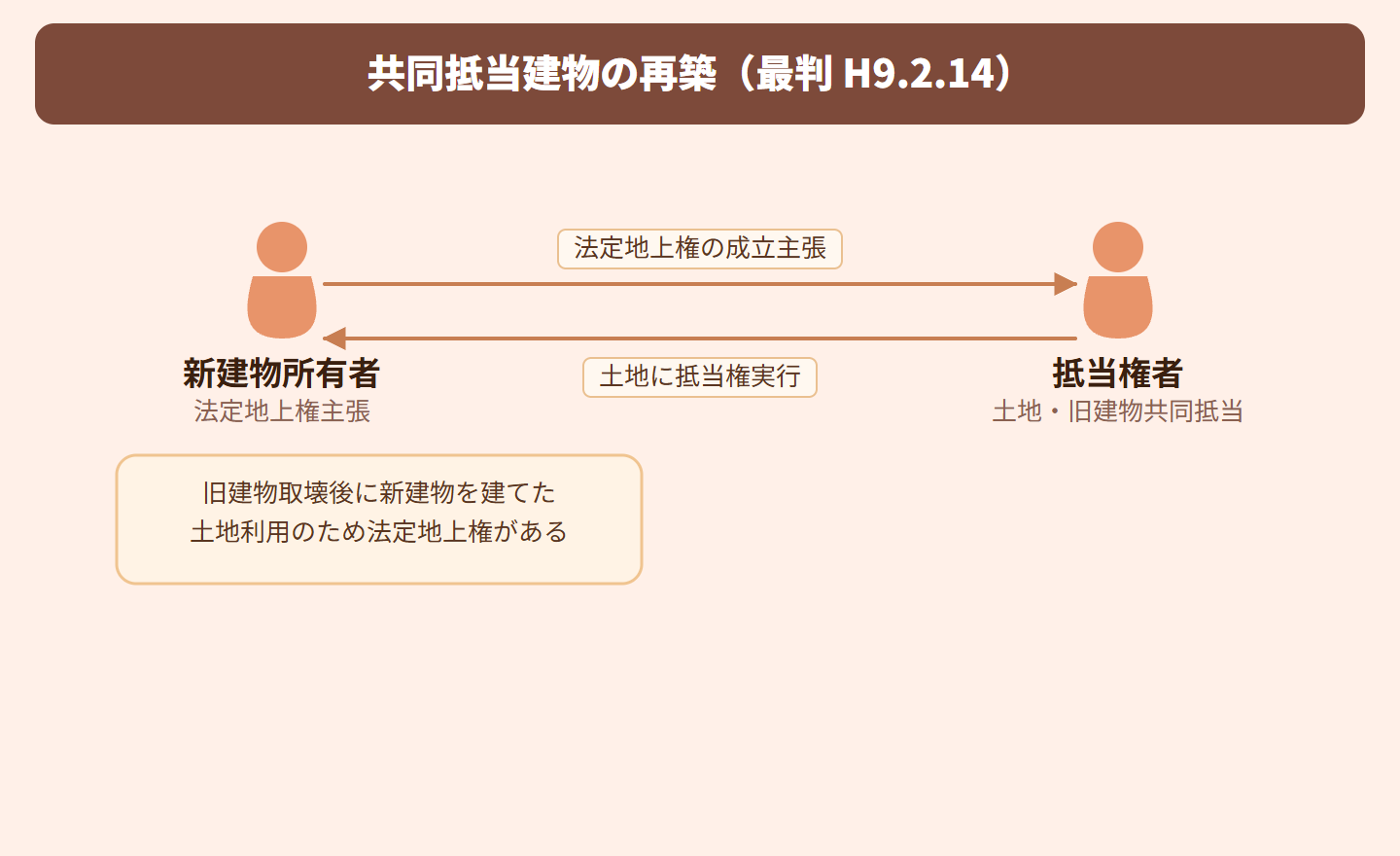 土地と地上建物に共同抵当権が設定された後、建物が取り壊されて新建物が再築された場合、新建物所有者と土地所有者が同一人物で、かつ抵当権者が新建物にも同順位の共同抵当権の設定を受けたといった特別な事情がない限り、新建物のために法定地上権は成立しない。共同抵当権者は土地と建物全体の担保価値をあわせて把握しているため、新建物に法定地上権が成立すると土地の担保価値が下がり、抵当権者に予期しない損害を与えることになるからである。