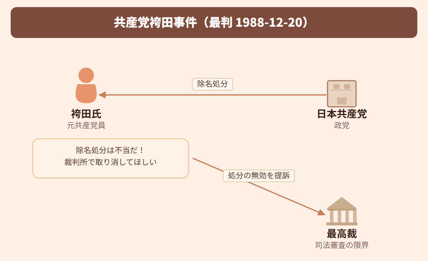 共産党の党員であった袴田氏が、党の方針に反したとして除名処分を受けました。袴田氏はこの処分が不当だとして裁判所に訴えましたが、最高裁判所は、政党内部の処分は政党の自主性・自律性に委ねられるべきであり、一般市民社会のルールとは直接関係しないため、裁判所は原則として審査できないと判断しました。