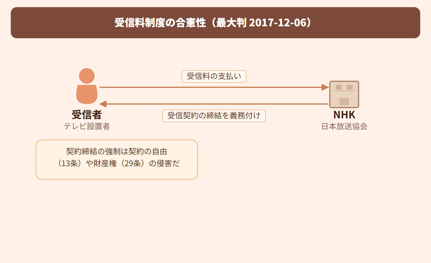 けんぽう13じょう(こじんのじゆう)、21じょう(ひょうげんのじゆう)、29じょう(ざいさんけん)に関わる判例です。ほうそうほう64じょう1こうが、NHKとのじゅしんけいやくのていけつをぎむづけていることが、これらのきほんてきじんけんにいはんするかどうかが争われました。
