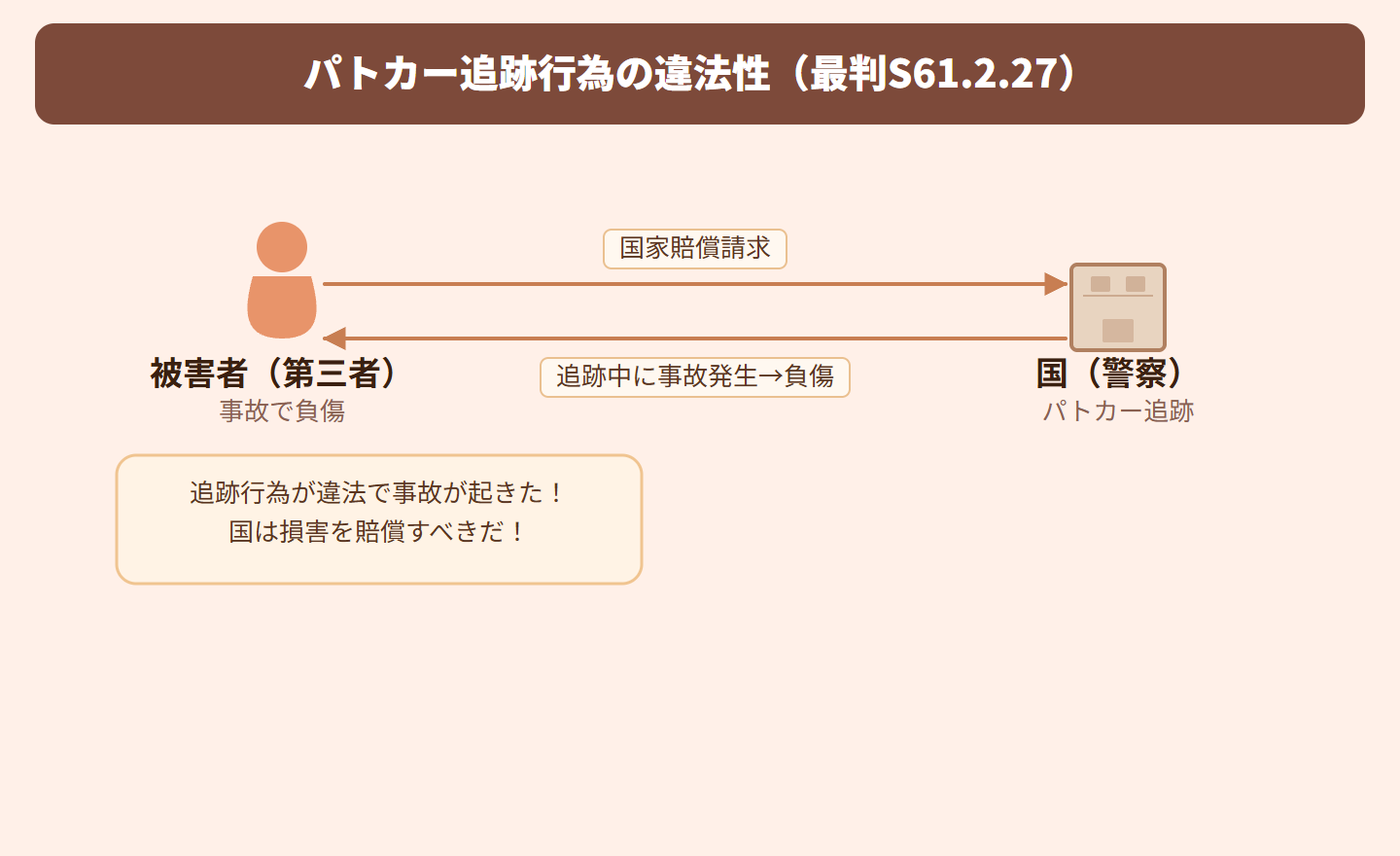 ■追跡行為自体は当然に違法ではない ■違法性の判断基準:①追跡の必要性(開始・継続の必要性)②追跡方法の相当性 ■「不必要」または「不相当」な追跡の場合に限り違法と判断される ■総合考慮:個別具体的な事情を総合的に判断する ■国賠法1条1項の適用場面:警察官の職務行為が違法かどうかの判断枠組みを示した重要判例