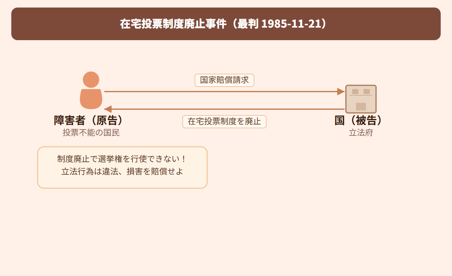 かつて存在した在宅投票制度が、不正が多いという理由で廃止されました。身体に障害があり投票所に行けない人々は、在宅投票制度がなくなったことで選挙権を行使できなくなりました。そこで、制度を廃止した立法行為が違法だとして、国に損害賠償を求めて訴えを起こした事件です。