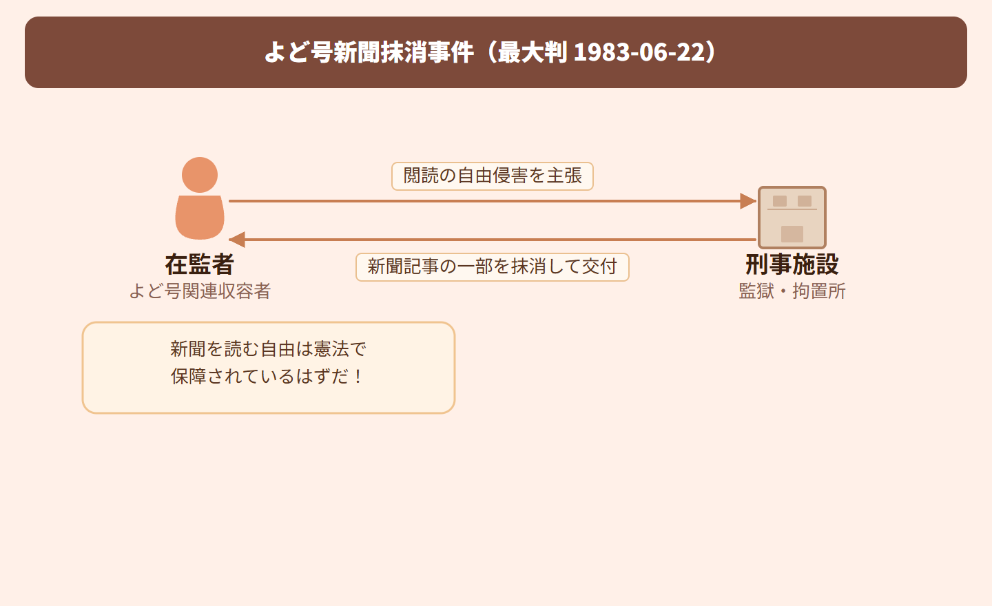 新聞や本を読む自由(閲読の自由)は、憲法19条・21条の趣旨から導かれる憲法上の権利として保障されます。しかし、刑事施設に収容されている人については、逃亡防止や証拠隠滅防止などの目的から、一定の制限はやむをえないとされます。ただし、制限が許されるためには、「読ませると施設内の秩序が乱される」という**具体的・相当な可能性(蓋然性)**が必要です。「なんとなく危なそう」という抽象的なおそれだけでは制限の根拠として不十分であり、制限は必要かつ合理的な範囲にとどめなければなりません。つまり、「収容されているから何でも制限できる」わけではなく、制限するには具体的な理由が必要だということです。 【原文】 まず、当該閲読を許すことにより、監獄内の規律や秩序が害される一般的、抽象的なおそれがあるといだけでは足りず、(左記理由で制限をすることは違反である)具体的事情のもとにおいて、①「監獄内の規律および秩序の維持上放置することのできない程度」の障害が生ずる「相当の蓋然性」があると認められることが必要でありかつ、②制限の程度は、上記障害発生の防止のために必要かつ合理的な範囲にとどめるべきものと解するのが相当である。