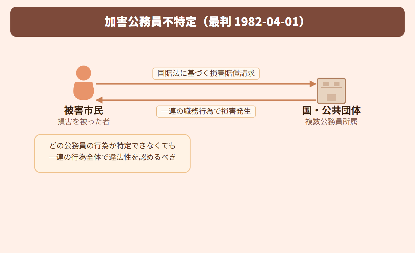 複数の公務員による一連の職務行為のいずれかに故意または過失(わざとまたはうっかりによる違法行為)がなければ損害が生じなかったと認められ、かつ国や公共団体が賠償責任を負う関係にある場合は、加害行為が特定できなくても賠償責任を免れることはできない。ただし、一連の行為の一部に職務外の行為が含まれる場合はこの限りでない。