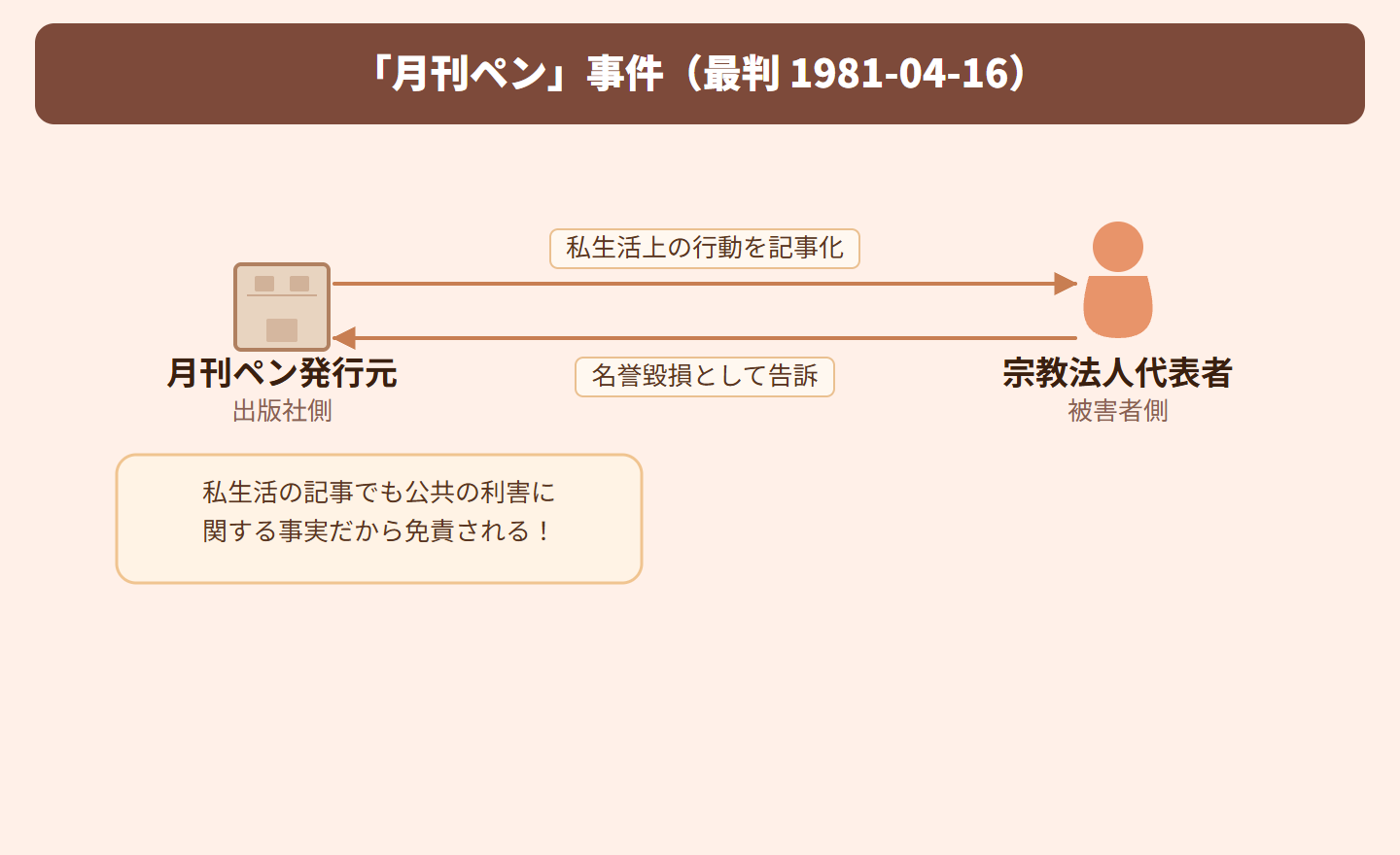 月刊誌「月刊ペン」が宗教法人の代表者の私生活上の行動を記事にしたところ、名誉毀損だとして訴えられた事件です。出版社側は「公共の利害に関する事実だから免責される」と主張しましたが、相手方は「単なる私生活のことで公共性はない」と反論しました。最高裁は、私人の私生活でも一定の場合には公共性が認められると判断しました。