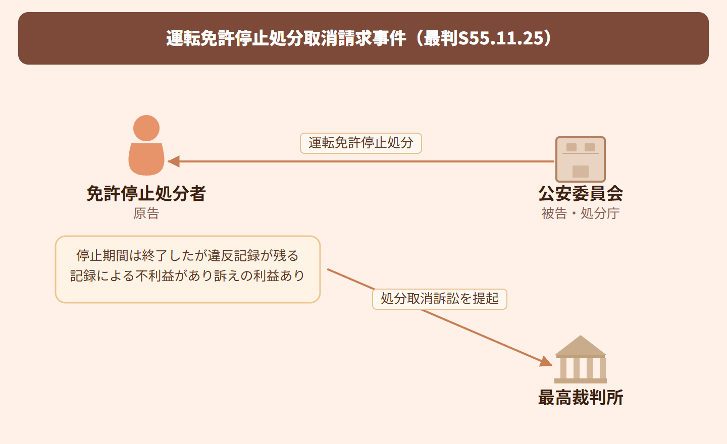 運転免許の停止処分を受けた人が、処分を不服として取消訴訟を起こそうとしました。しかし、停止期間が終わって免許が使えるようになり、さらにその後1年間無事故無違反で過ごしたため、処分による実際の不利益はなくなりました。それでも警察に違反記録が残っていることを理由に訴訟を続けられるかが争われた事件です。