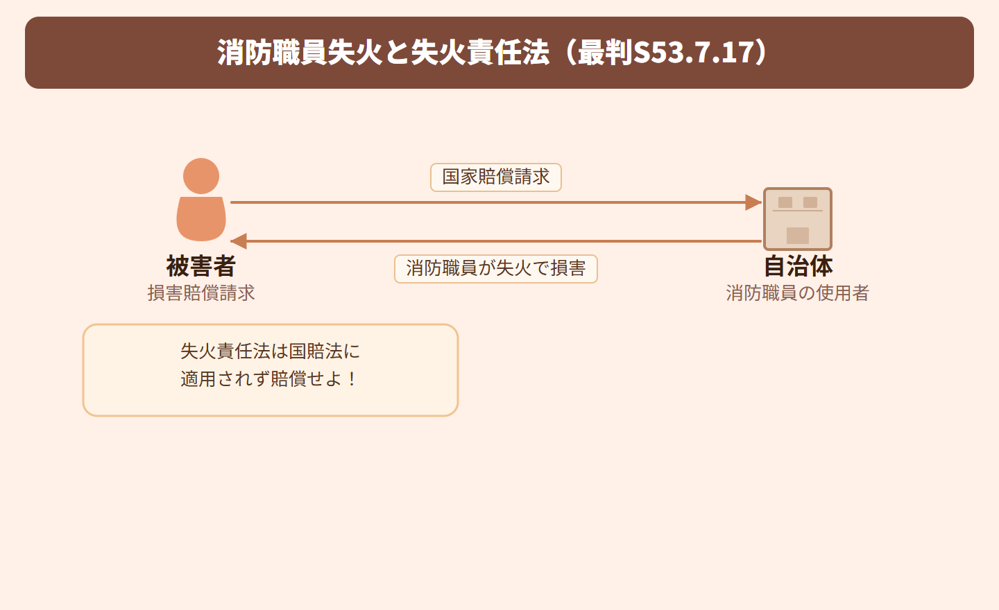 消防職員が公務中に不注意で火災を起こしてしまった事件です。被害者は自治体に対して国家賠償を求めましたが、その際に問題となったのは、一般人の失火に適用される「失火責任法」が公務員の失火にも適用されるかどうかでした。失火責任法が適用されれば、軽い過失では賠償責任が免除されるため、重要な争点となりました。
