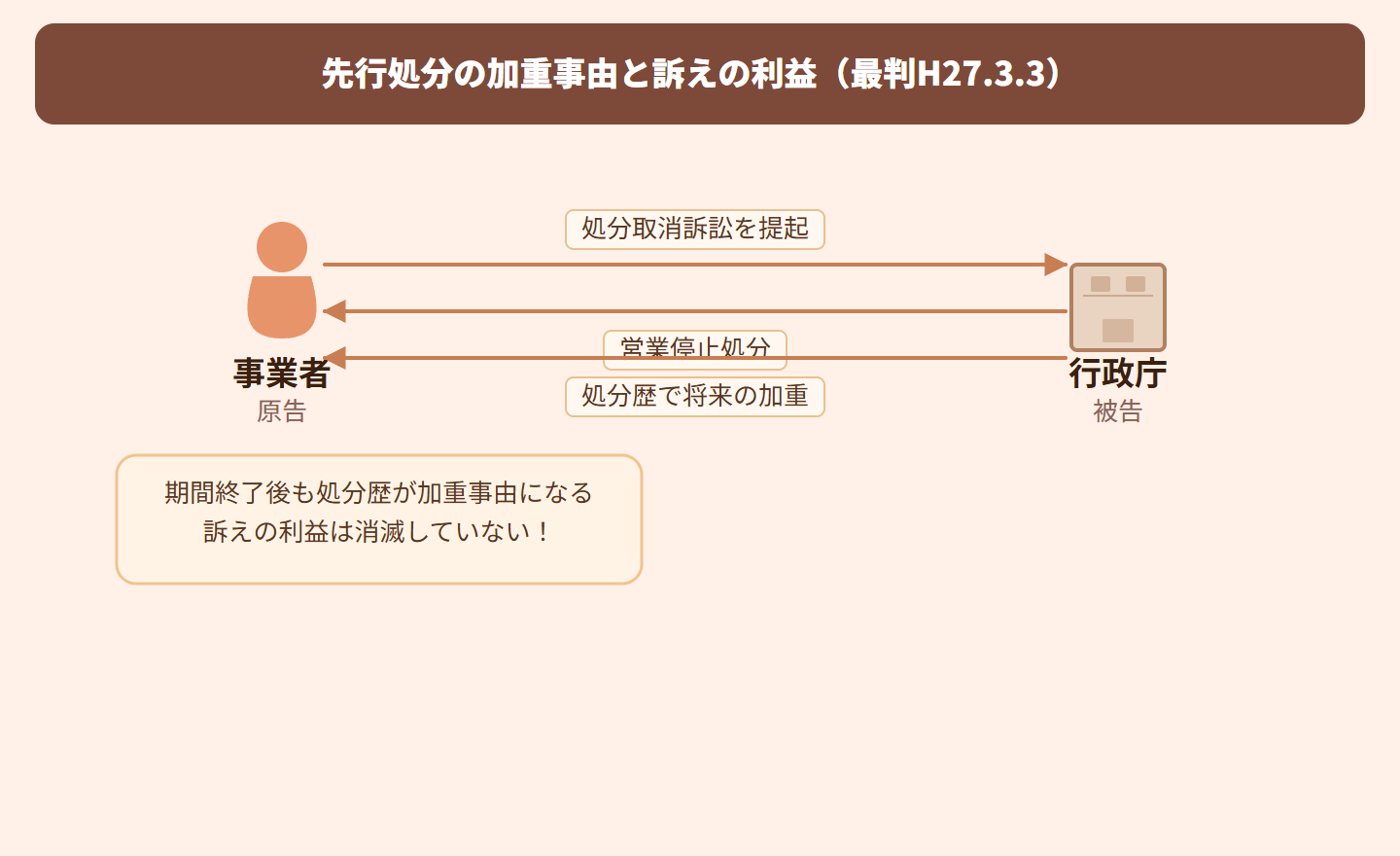 要するに、営業停止期間が終わっても、その処分歴が将来の処分を重くする基準になっている以上、取り消してもらう意味があるから訴えられるってこと!