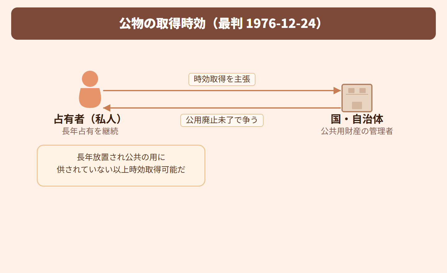 ある土地が昔は公共用財産(道路など)として使われていましたが、長年放置されて公共施設としての形も働きもなくなっていました。そこに私人が平穏に占有し続けたため、時効取得できるかが争われました。国や自治体は「正式な公用廃止手続きがないから時効取得は認められない」と主張しましたが、裁判所の判断が問題となった事案です。