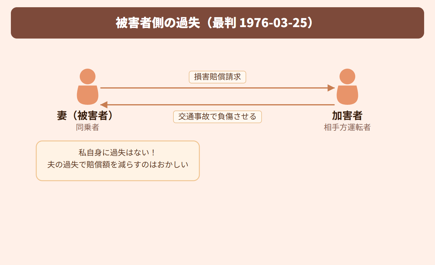 夫が運転する車に妻が同乗中、交通事故が発生し妻が負傷しました。妻が加害者に損害賠償を請求したところ、加害者側は「事故は夫の運転ミスも原因だから、夫の過失分を考慮して妻への賠償額を減らすべきだ」と主張しました。妻は「私自身に過失はない。夫は別人格だから夫の過失で私の賠償額を減らすのはおかしい」と反論した事案です。
