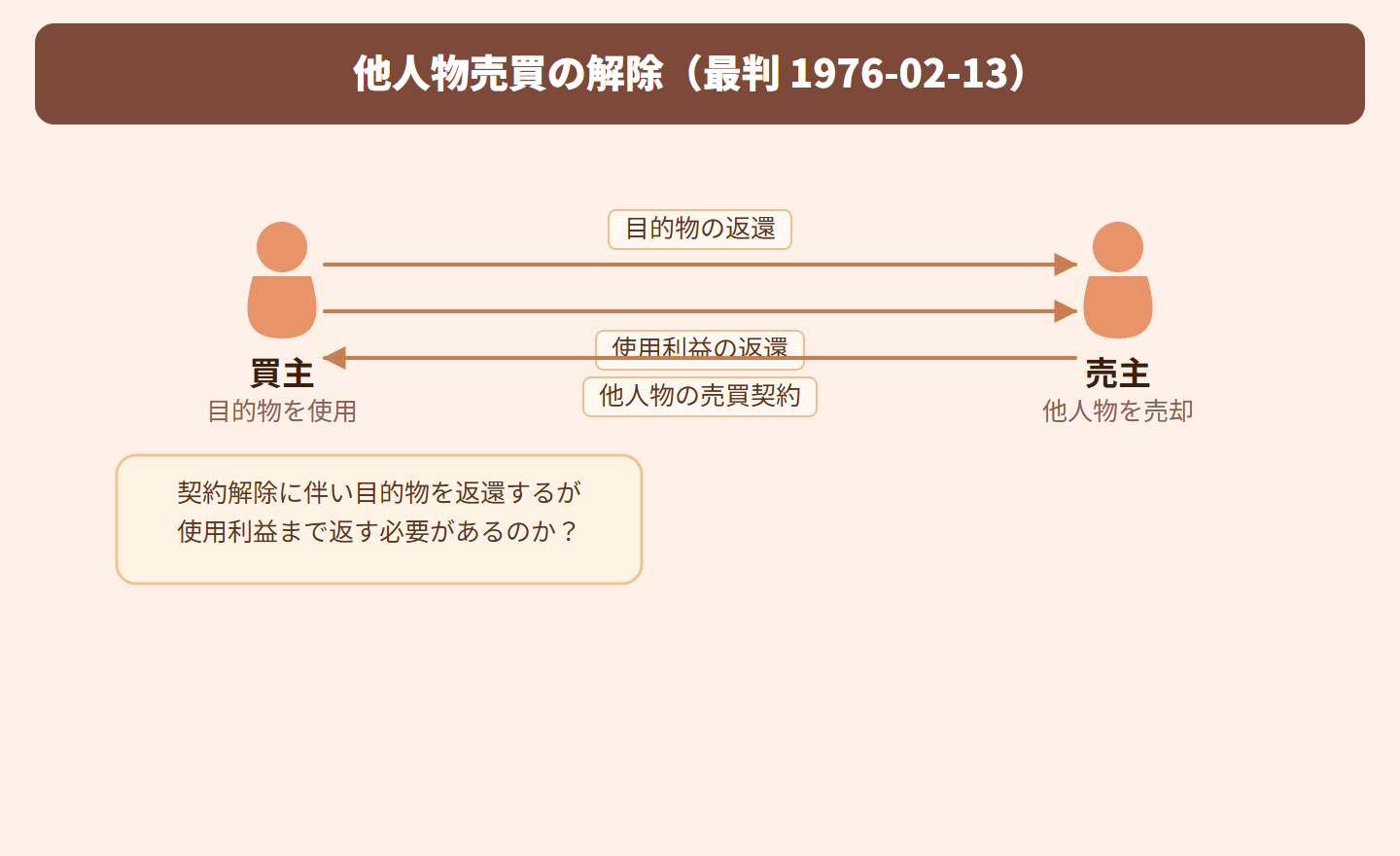 自分のものでない物を売る契約(他人物売買)が解除された場合、買主は契約期間中に目的物を使用して得た利益(例:車を使ったことで生じた価値の減少分)を売主に返還する義務を負うのか、というのがこの事件の争点です。