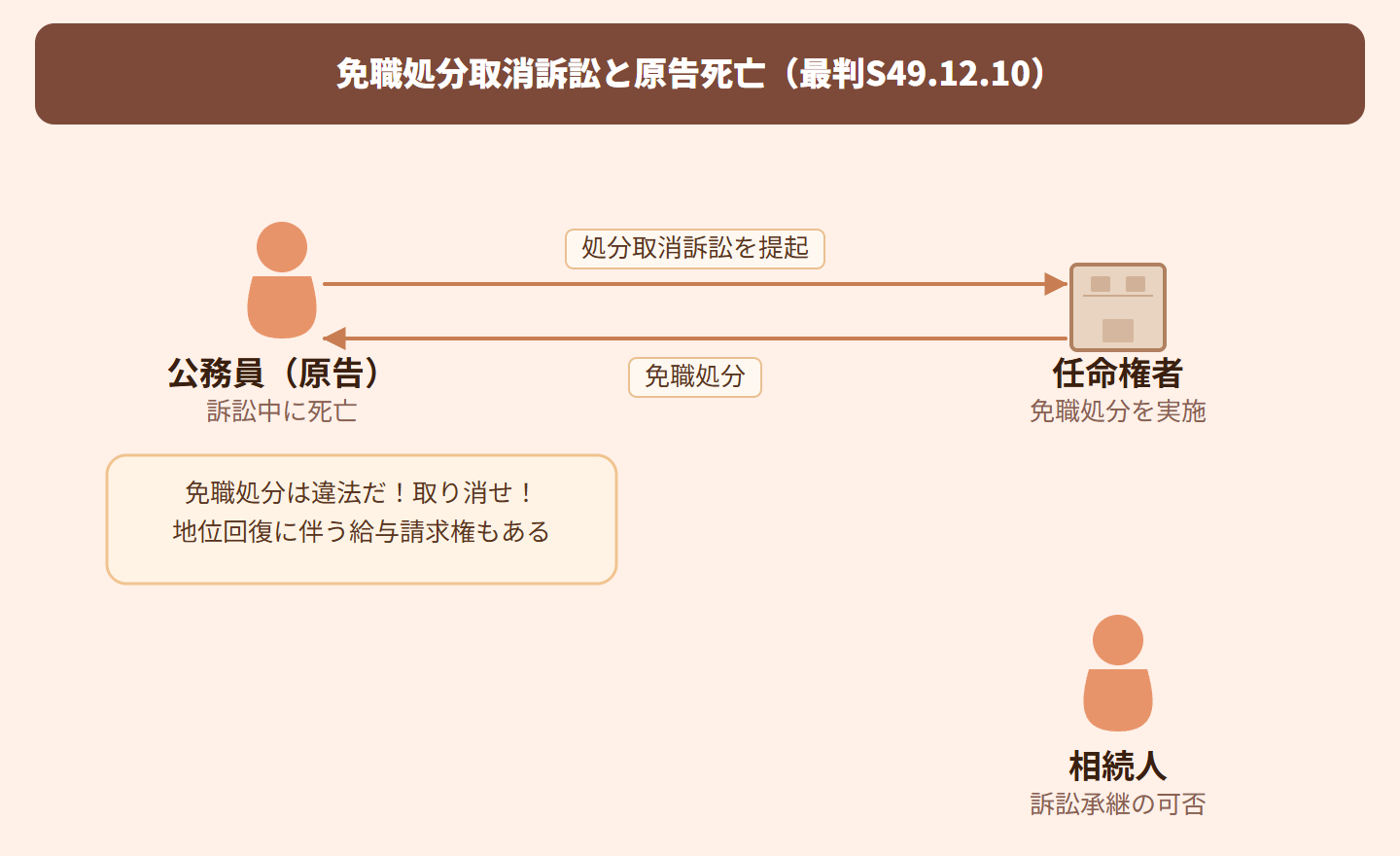 要するに、公務員の地位自体は相続できないけど、処分が取り消されれば死亡までの給料がもらえる可能性があるから、その財産的利益のために相続人が訴訟を引き継げるってこと!