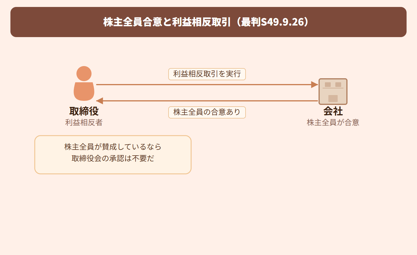 要するに、株主全員がOKと言っているなら、わざわざ取締役会の承認を取る必要はないってこと!会社の持ち主である株主みんなが賛成してるんだから、改めて手続きする意味がないよねってことです。