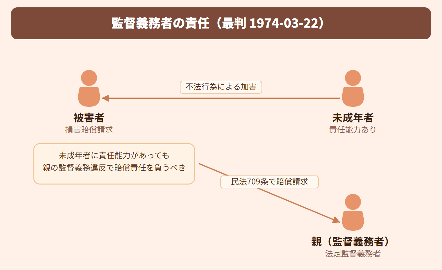 民法714条1項は責任能力のない未成年者の監督義務者責任を定めていますが、本判例は責任能力がある未成年者の場合でも、親が監督義務を怠れば民法709条の一般不法行為責任を負うとした点が重要です。